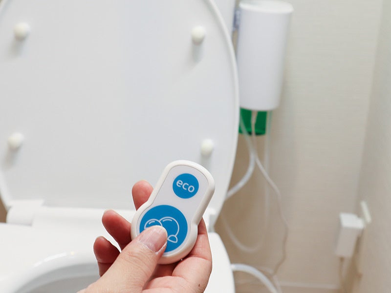 取り付けは洗剤タンク付きの本体をトイレまたは壁に貼り付け、チューブをトイレタンクに入れ、ノズルを便座側にセットすればOK。工事不要で簡単に設置できます。使い方は本体のタンク(400ml)に市販の中性洗剤を入れて本体またはリモコンのボタンを押すとトイレタンク内の水と中性洗剤を混ぜ合わせて、ノズル部分からきめ細かい泡が発生。泡のクッションが飛び跳ねを防止します。さらに発生した泡でコーティングし汚れも防止します。泡の出る時間は20秒間(ノーマルモード)、10秒間