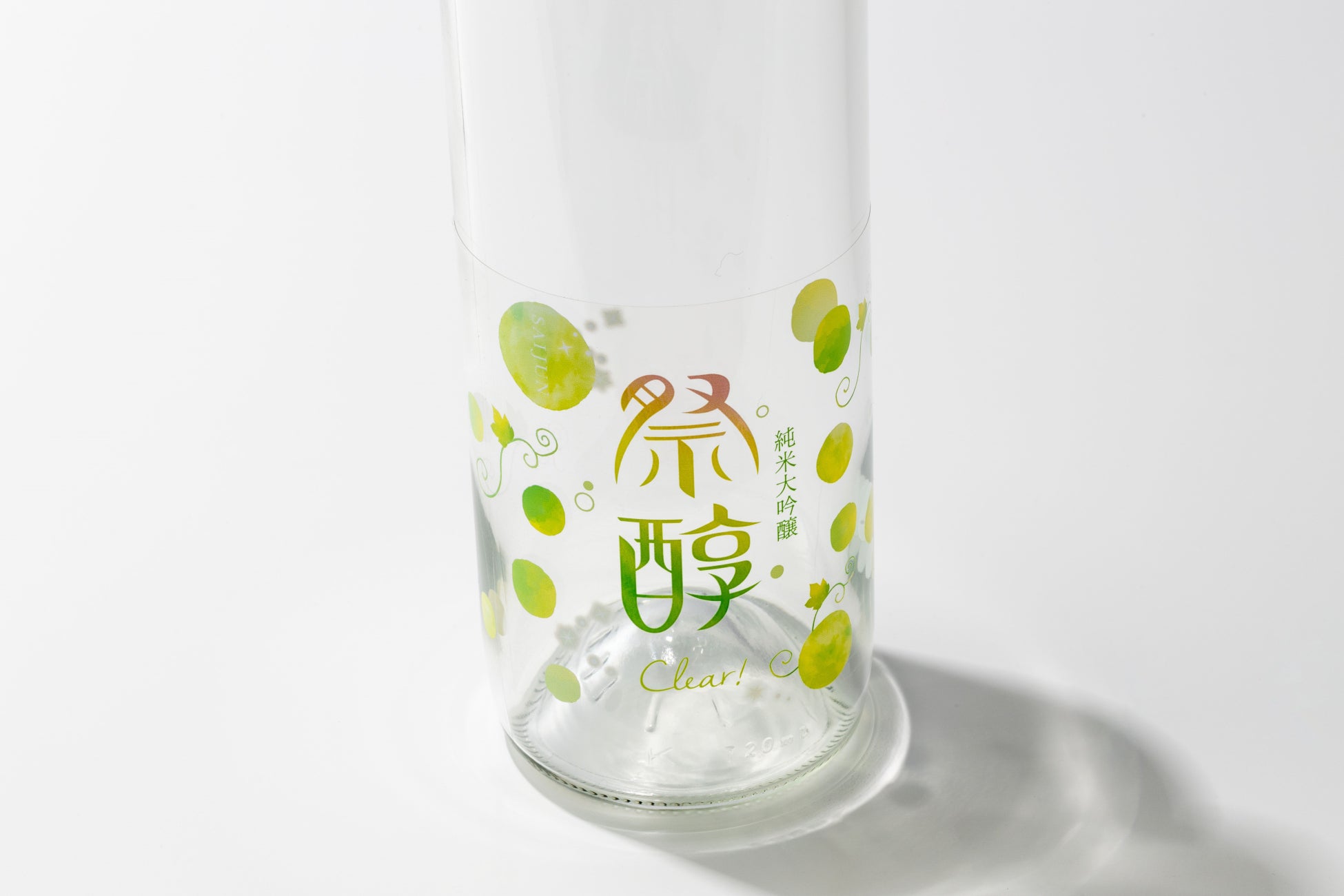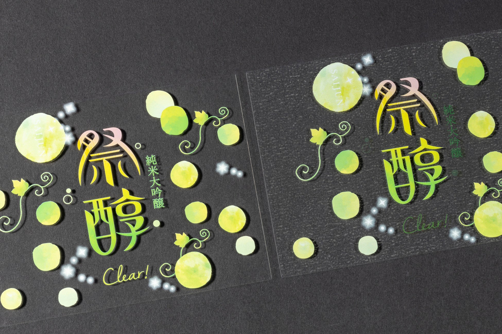 本製品は瓶などの透き通った容器に貼ると、印刷箇所が直接印刷したような仕上がりになります。日本酒やワインなど透明な瓶に充填するアルコール類や清涼飲料水、その他、意匠性の高さが求められる化粧品や雑貨のラベルに適しています。