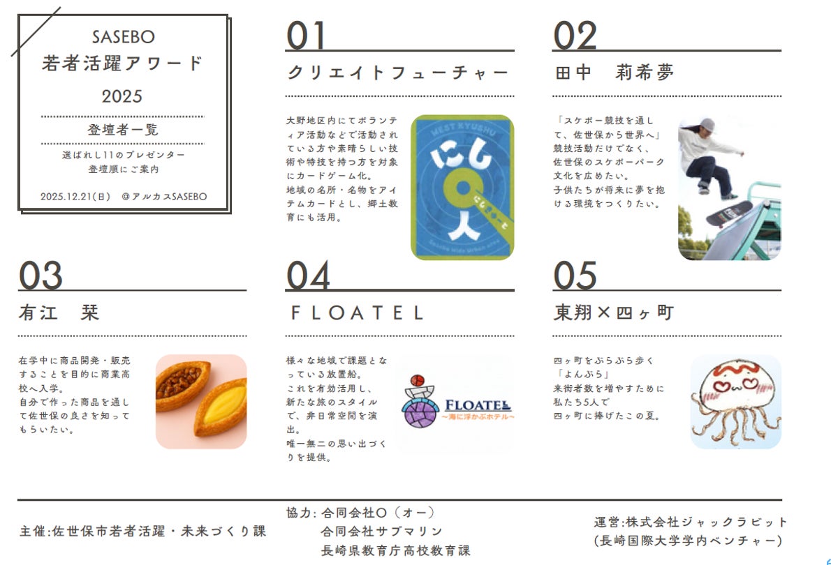 長崎県佐世保市は、「日本一、若者の“夢”を後押しするまち」を目指し、令和7年(2025年)12月21日、地域課題の解決や街の活性化に挑む若者を対象とした「SASEBO若者活躍アワード 2025」を開催いたしました。