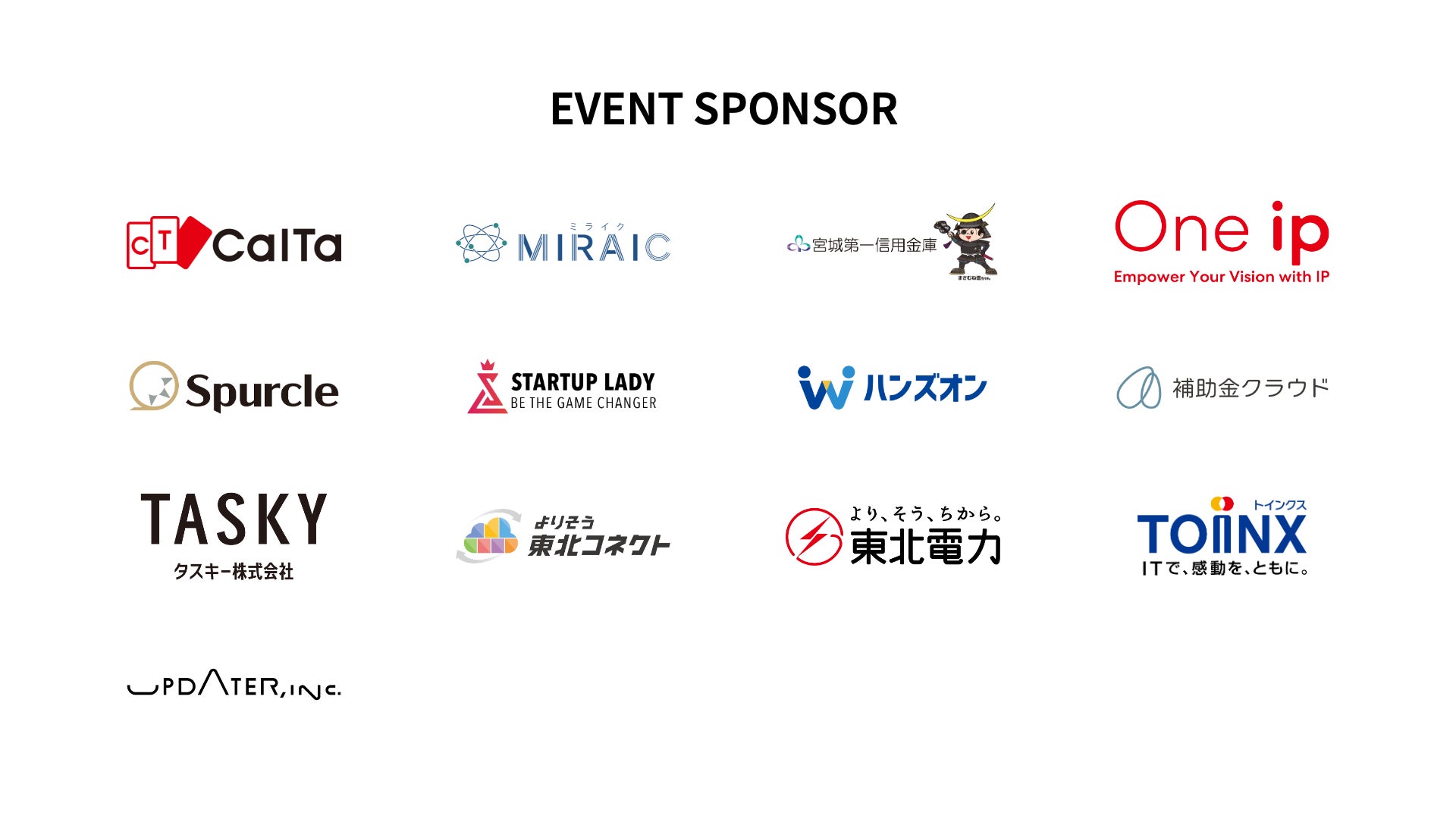 共催:東北大学、東北経済産業局、宮城県、みちのくアカデミア発スタートアップ共創プラットフォーム、ジェトロ仙台、NTT都市開発株式会社、株式会社七十七銀行