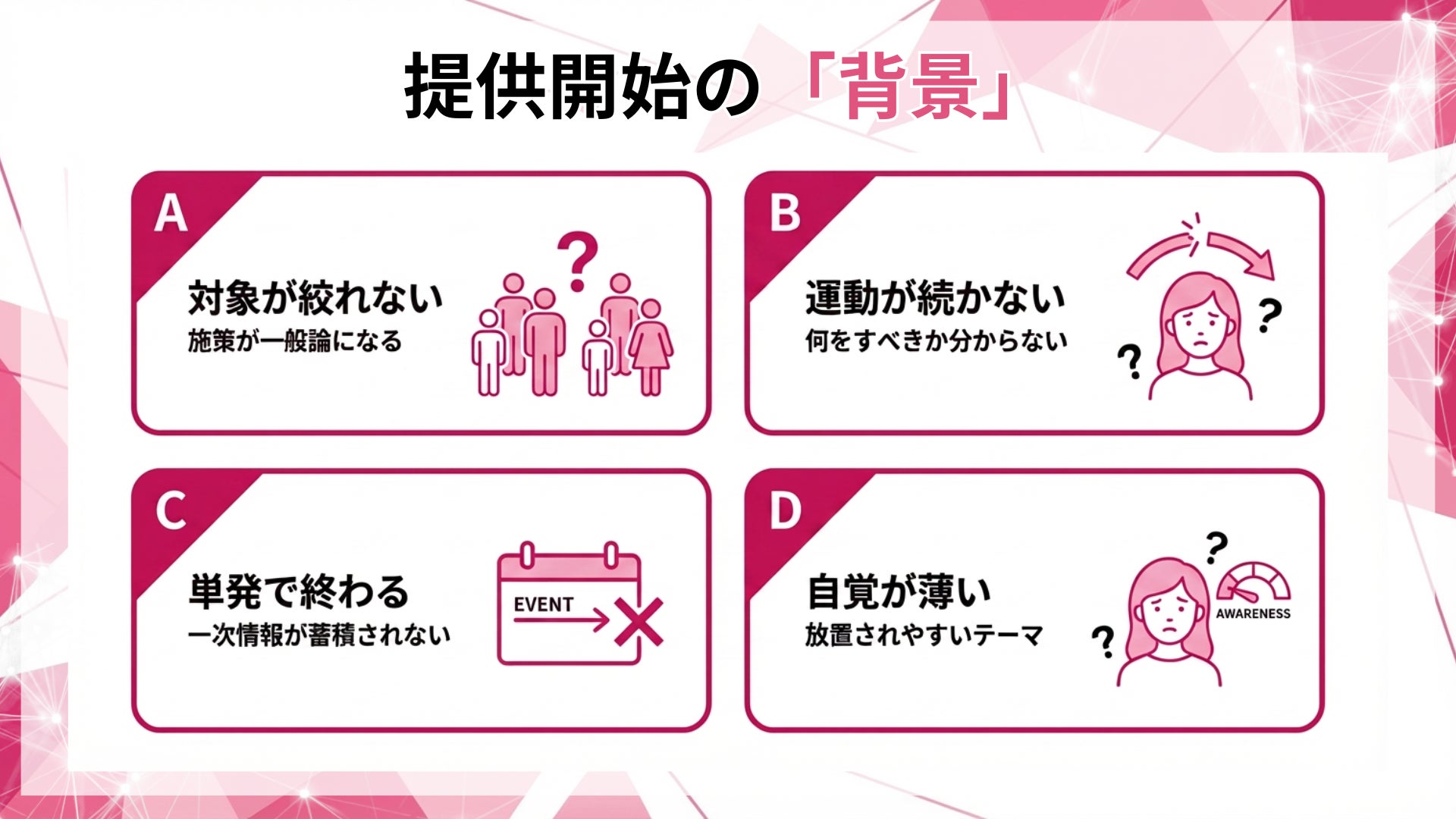 当社は、痩せ課題は筋量増加の設計が要であるという前提に立ち、運動習慣がない層でも実行しやすい導線を含めた運用パッケージとして提供します。