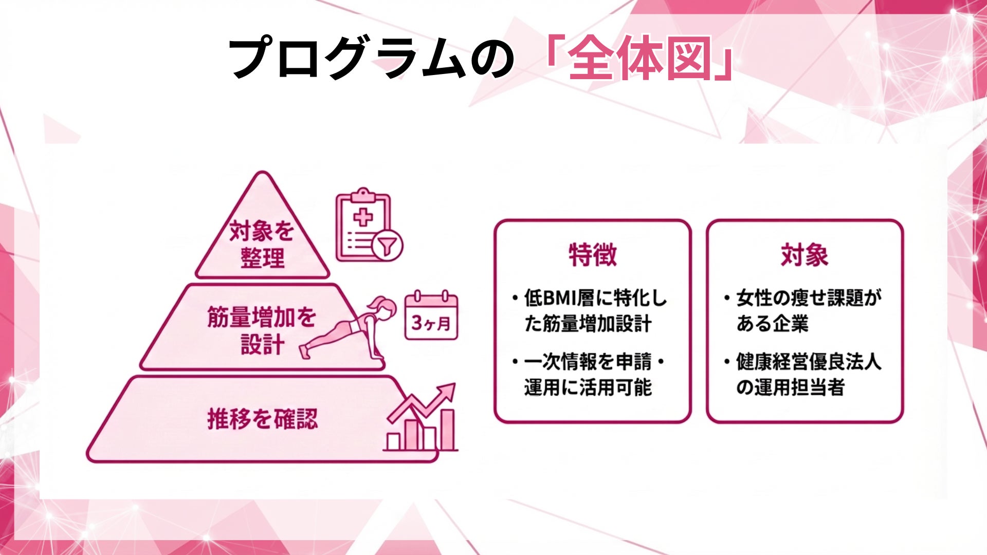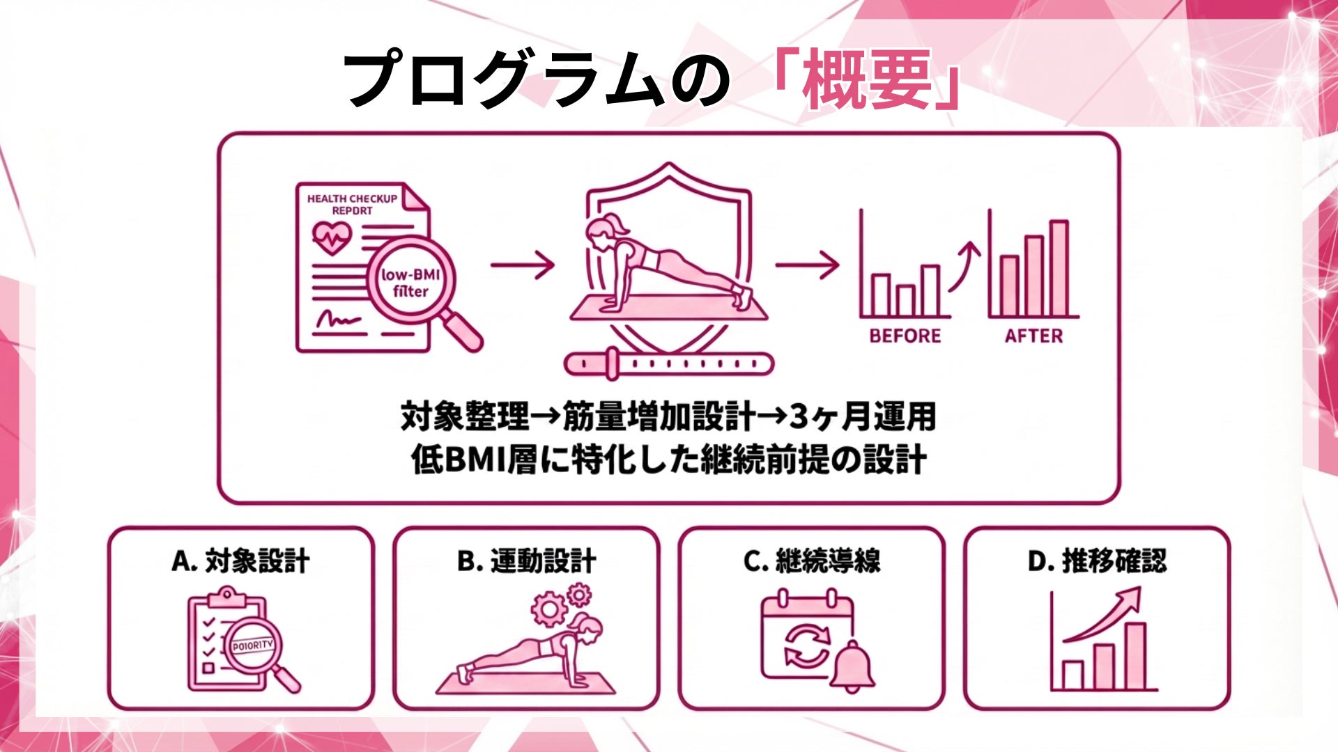 本プログラムは、企業が保有する健康診断結果等を起点に対象を整理し、低BMI層に対して筋量増加を狙う運動プログラムを3ヶ月で実装する支援です。
