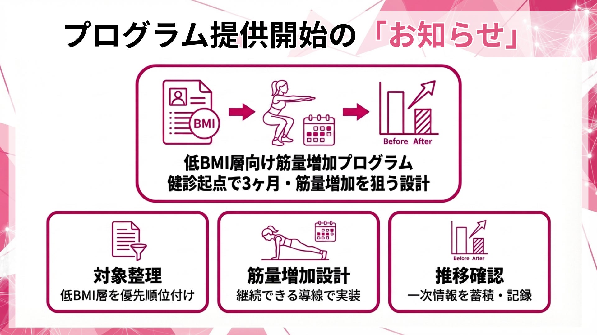 本プログラムは、低BMI層に対して「体重を増やす」ではなく、筋量増加を前提に運動設計を行い、3ヶ月の運用で実施状況と変化を確認できる形に整備します。