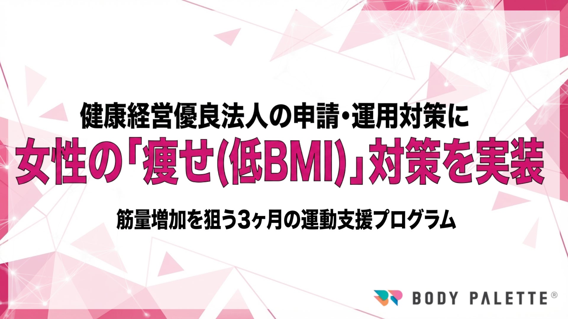 本プログラムは、健康経営優良法人の申請・運用を見据え、女性の健康課題の一つである低BMI・痩せ傾向に対して、筋量増加を狙う運動プログラムを3ヶ月で実装し、一次情報と推移確認までを整備する支援です。