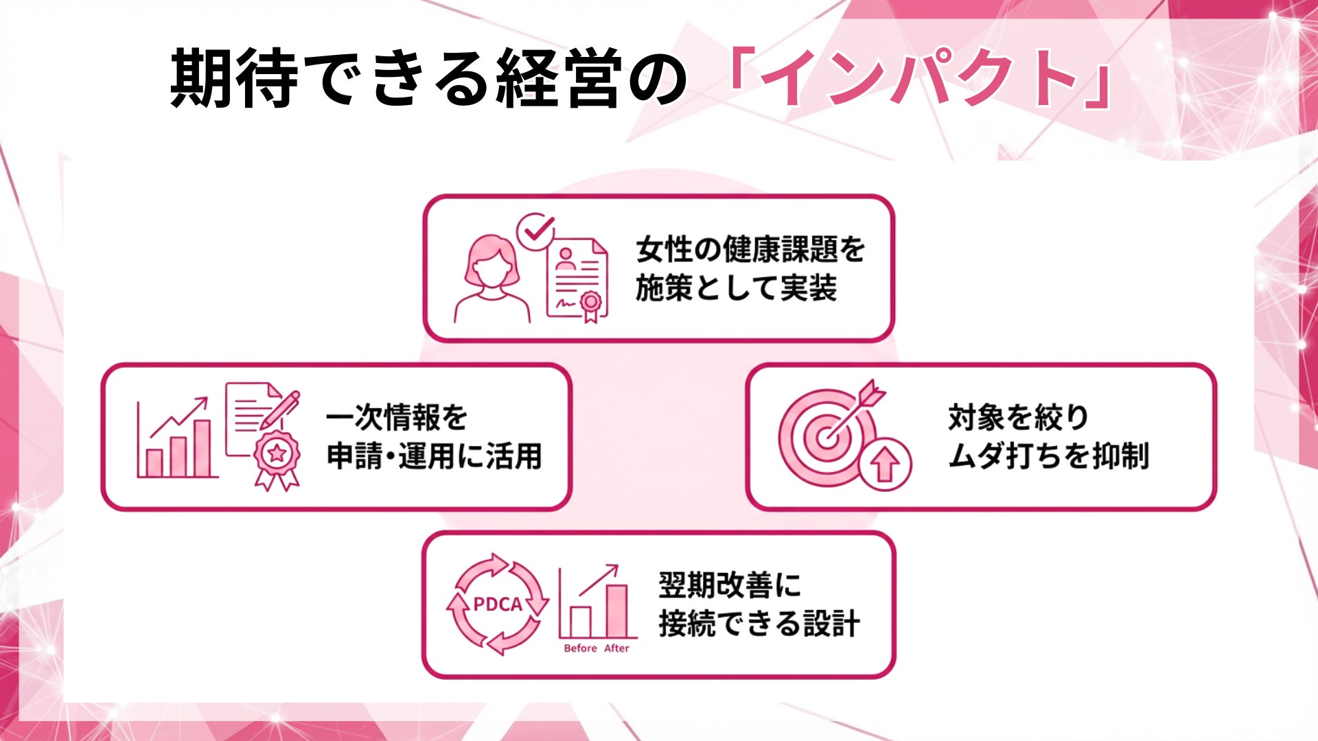 女性の健康課題への対応は健康経営の実務テーマとして整理されており、運用として回せる形に落とし込みます。