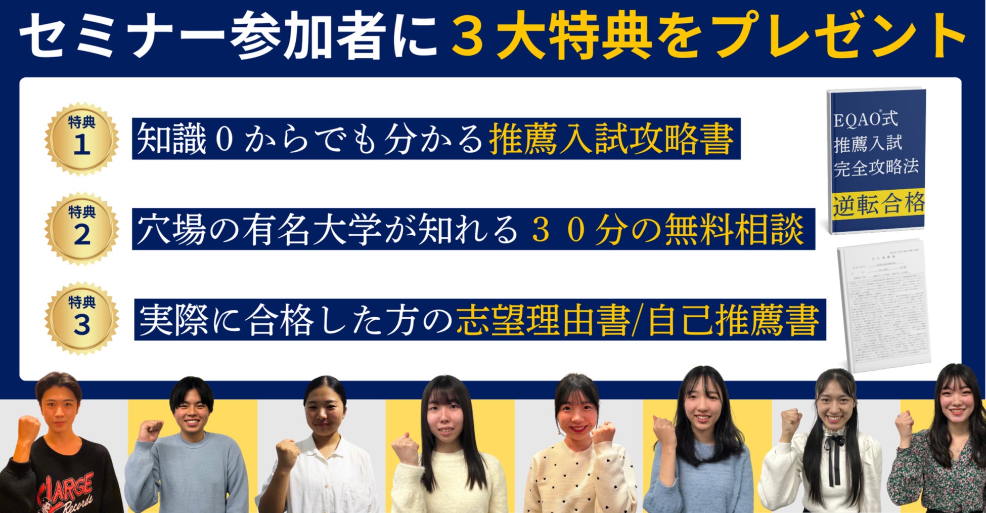 無料体験授業は「一対一でちょっとハードルが高い…」と感じている高校1年生・2年生のあなた!そんなあなたに向けて、EQAOでは総合型選抜や早期対策のポイントがわかるセミナーを開催中です。早めの情報収集が合格への鍵を握ります。進路をしっかり考えたい方や、今から対策を始めたい方は、ぜひこちらのリンクをチェックしてみてください!