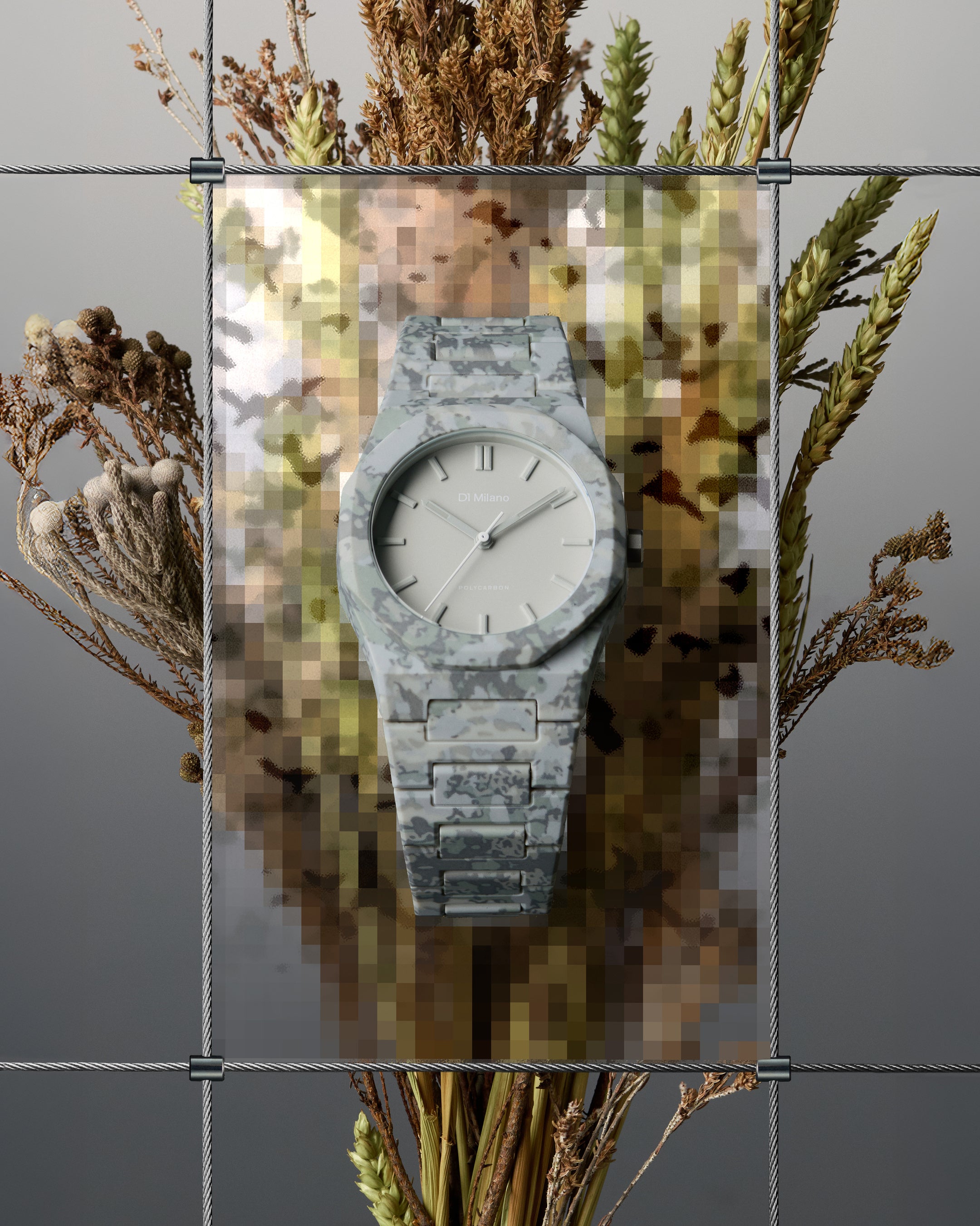 自然のフラクタル構造から着想を得た、有機的で抽象的なカモパターン。ケース、ダイヤル、ブレスレットを一体化させ、視覚的なノイズを削ぎ落としたモダンカモ。