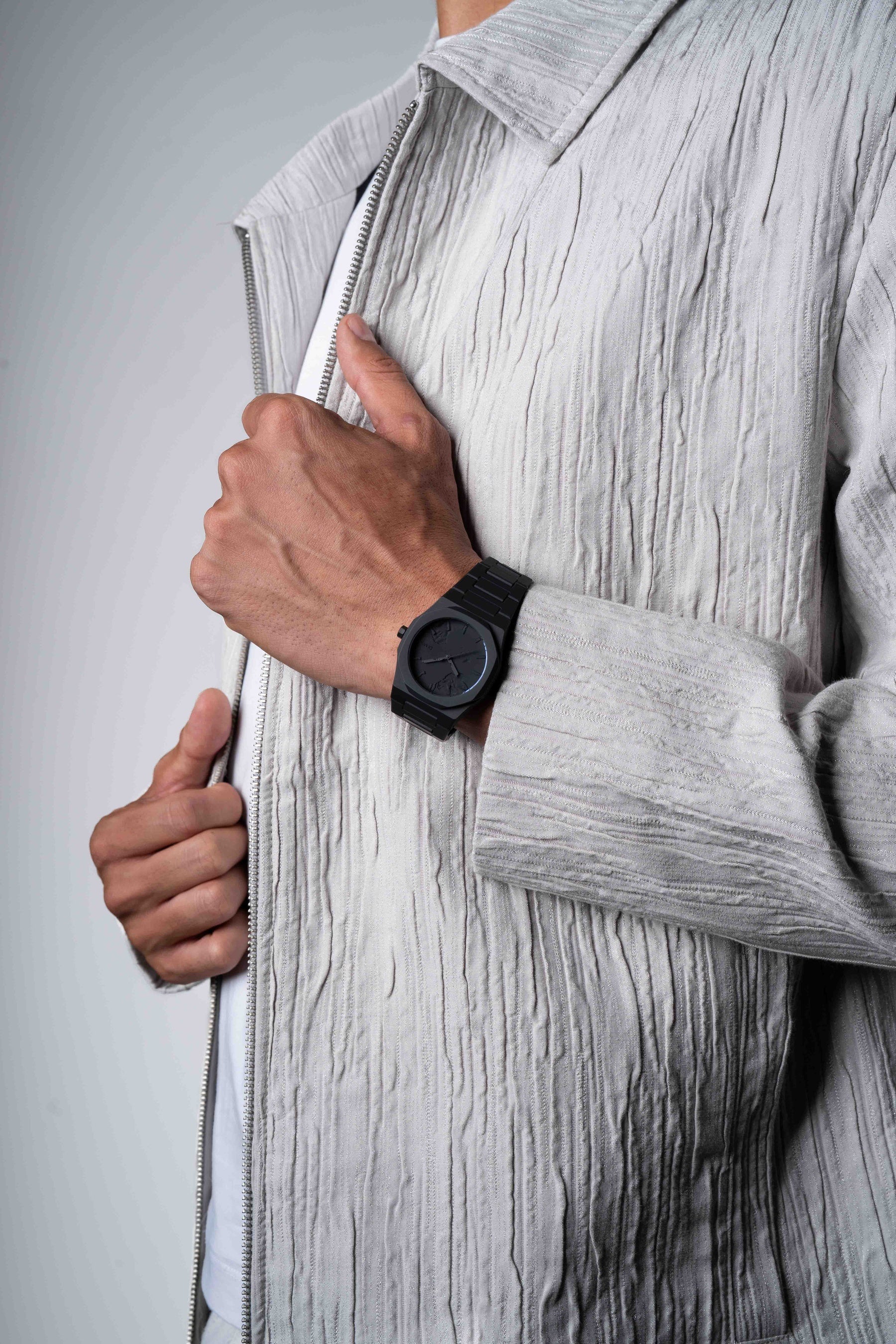 モノクロームの陰影が唯一無二の存在感を与え、まさに“身に着けるアート”となる一本。