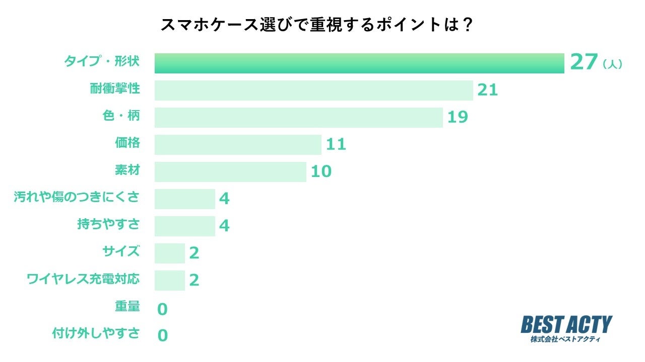 スマホケース選びで重視するポイントについて100人にアンケートを行ったところ、「タイプ・形状」と回答する人が最も多い結果となりました。