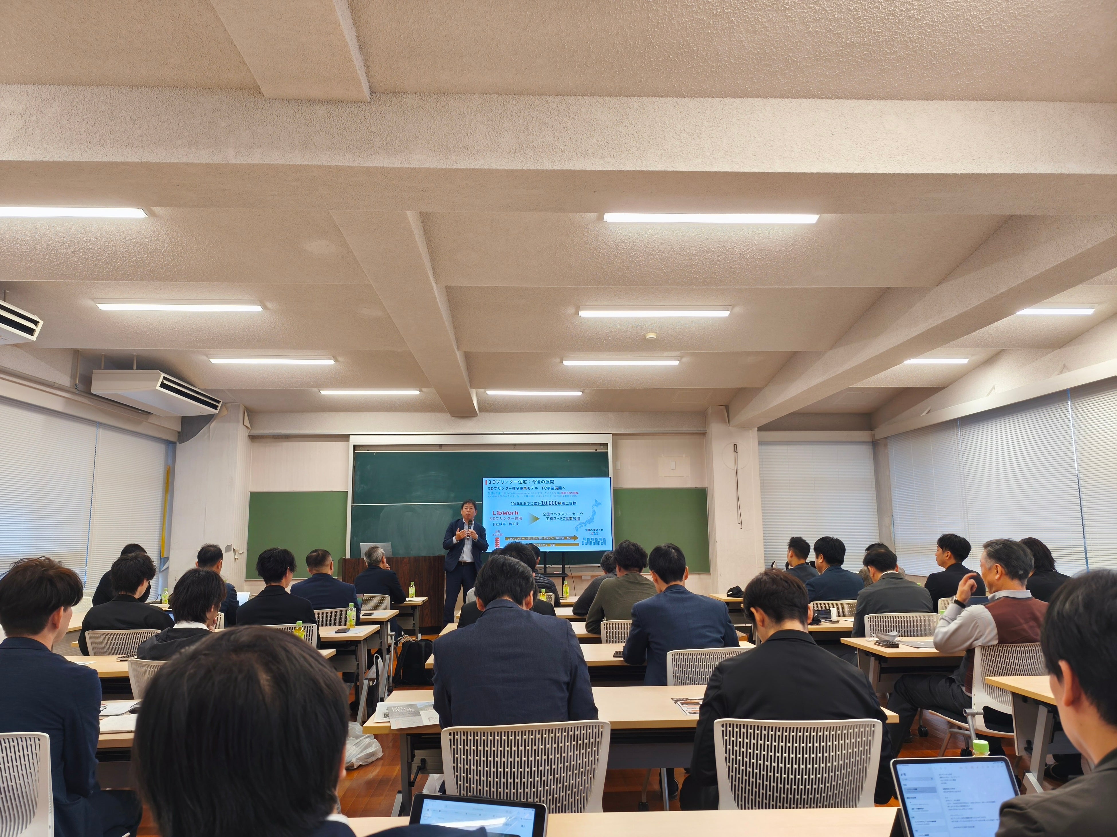 瀬口社長は、「レッドオーシャンの時代、競合で戦っても共倒れになる」と指摘し、全国のハウスメーカーや工務店との連携(共業)の重要性を強調。同社は2040年までにリブアースハウスを1万棟供給する目標を掲げ、ローリスクで参入できるよう、FC事業として技術やデータ(3D CADモデル作成など)を提供する方針と説明。