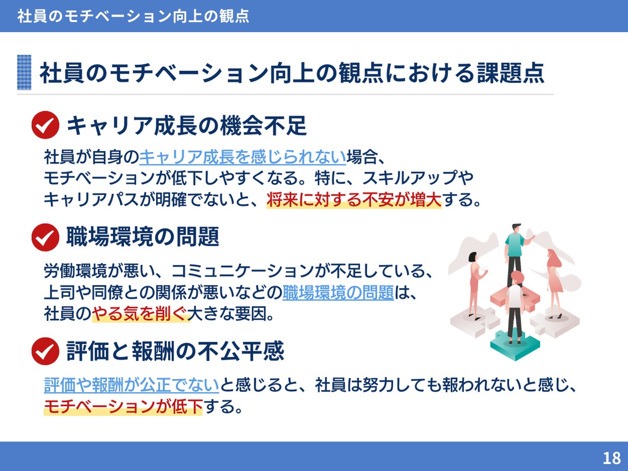 しかし、適切なスキル向上の支援や職場環境の整備、評価と報酬の公正さを保つことができないと、社員のモチベーションが低下するリスクがあります。また、これらの要素が欠けることで、社員のモチベーションが低下し、離職率の上昇にもつながる危険性があります。