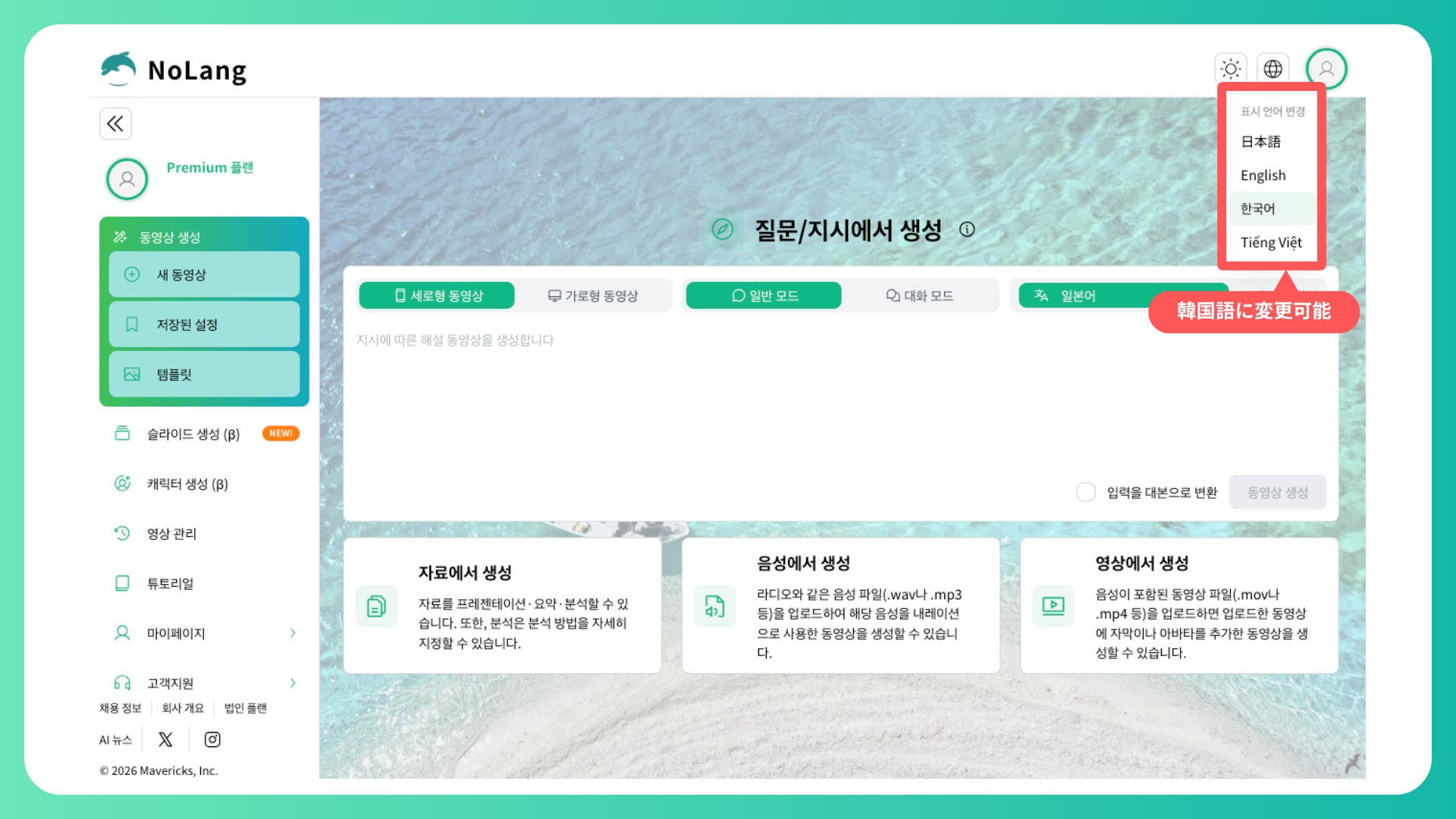 言語の切り替え操作はとてもシンプルです。画面右上の地球儀アイコンをクリックするだけで、「English / 日本語 / 한국어 / Tiếng Việt」の中から自身が使いやすい言語を選べます。選択するとその場で表示言語が切り替わるため、ベトナム語を母語とするユーザーは、翻訳ツールや辞書を挟むことなく、NoLangにはじめて触れる瞬間から迷わず動画制作に着手できます。これまで「ツールの操作言語が分からないので一歩踏み出せなかった」というベトナム語ネイティブの方々にとっても、ハードルなく使い始められる環境が整いました。