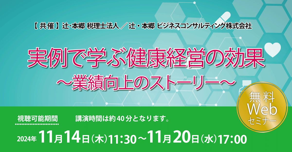 辻・本郷 税理士法人(本社:東京都新宿区、理事長:徳田孝司)は、辻・本郷 ビジネスコンサルティング株式会社(本社:東京都千代田区、代表取締役社長:金子寿一)と2社共催で「実例で学ぶ健康経営の効果~業績向上のストーリー~」セミナーを開催いたします。経済産業省が推進している「健康経営」は、従業員の健康管理を経営視点で戦略的に進め、健康投資により活力や生産性を高め、最終的に業績や株価の向上を目指す取り組みです。本セミナーでは、経営層からの取り組み(トップダウン)と従業員主導の取り組み(ボトムアップ)の成功事例を紹介します。