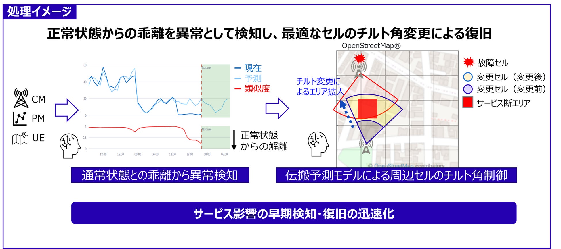 単一セル※10における異常検知技術では、トラフィックの低下要因が単純な負荷低下なのか、異常なのかの判断が困難な状況がありました。本技術では、単一セルではなく、周辺セルとトラフィック傾向を比較してAIにより判断することで、高い故障検知精度(適合率92%以上)を実現しました。少ない故障データでの教師あり学習や、教師なし学習にも対応しています。また、セルの重畳状況を踏まえたサービス影響度を把握することにより、優先的に復旧させるエリアを判断することが可能です。