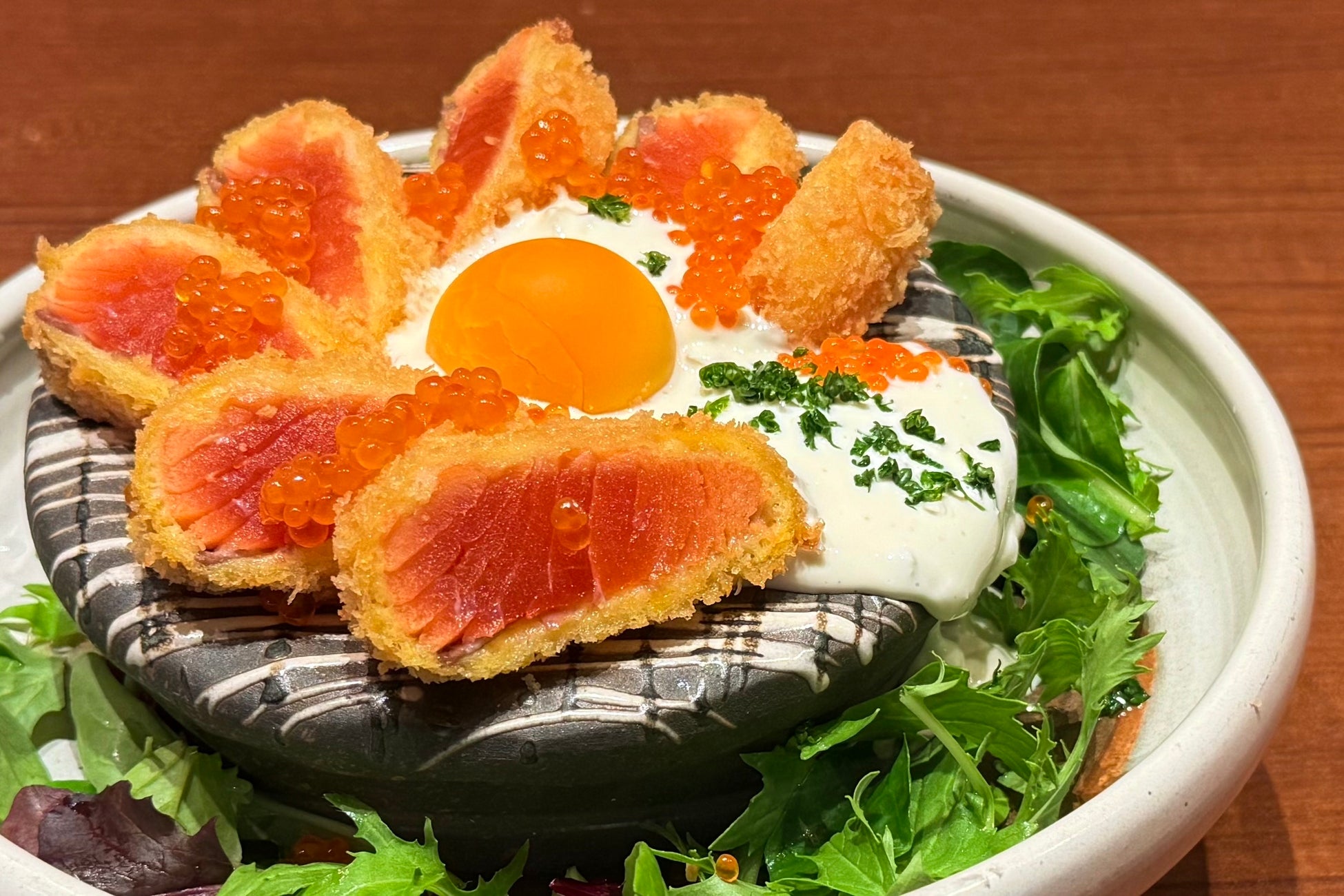 味わいは、脂がのっていながらも上品で、クセのないまろやかさが特徴。焼いても、蒸しても美味しい魚ですが、本メニューではあえて“レアカツ”に仕上げ、サクラマス本来のなめらかな舌ざわりを楽しめるよう工夫しています。その上から、北海道産のいくらをたっぷりとかけることで、まろやかな旨みと弾ける食感が口の中で楽しめます。
