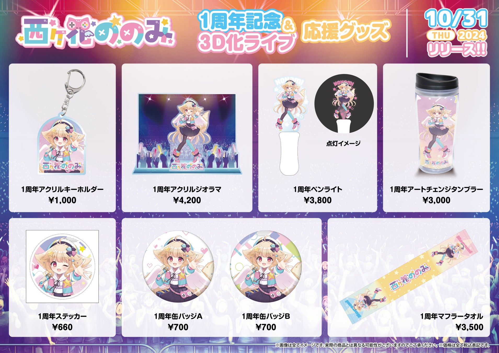 その「西ヶ花ののみオフィシャルストア」で、1周年記念&3D化ライブ応援グッズを10月31日より販売を開始いたします。