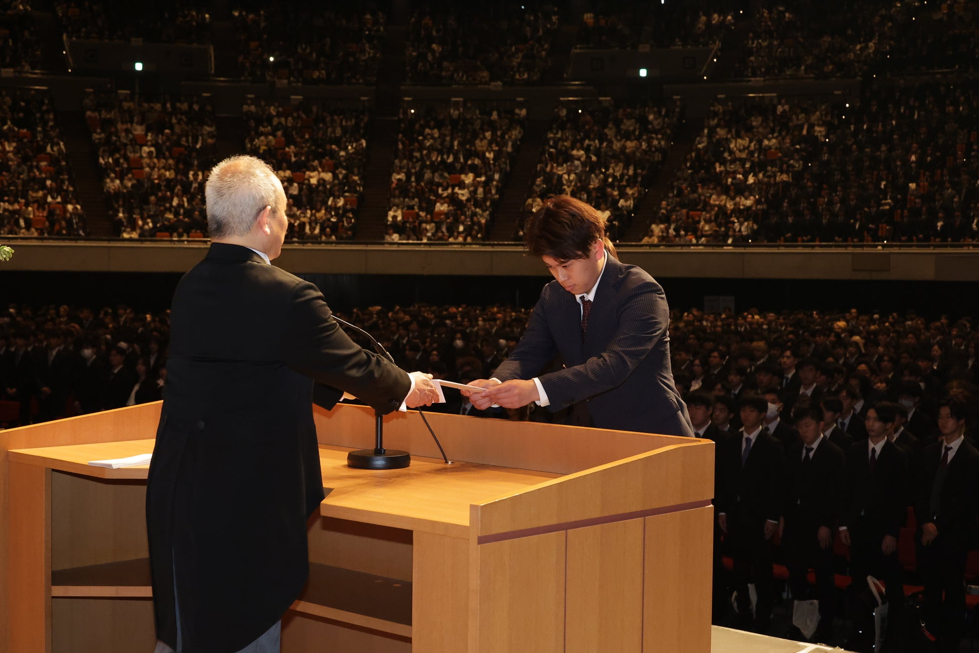 当日は、オーディションを経て選出された国際学科4年の西原志成さんと法律学科4年の酒井梨杏さんが司会を務めました。数多くの候補者の中から選ばれた2名が、この晴れの舞台で新入生を迎える重要な役割を担いました。