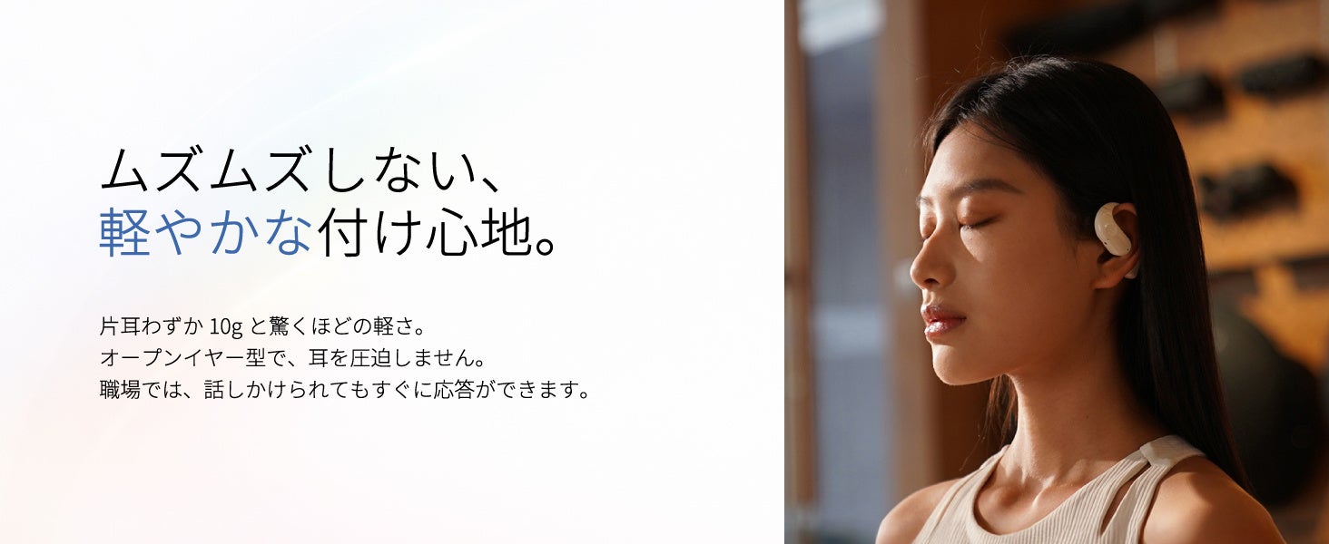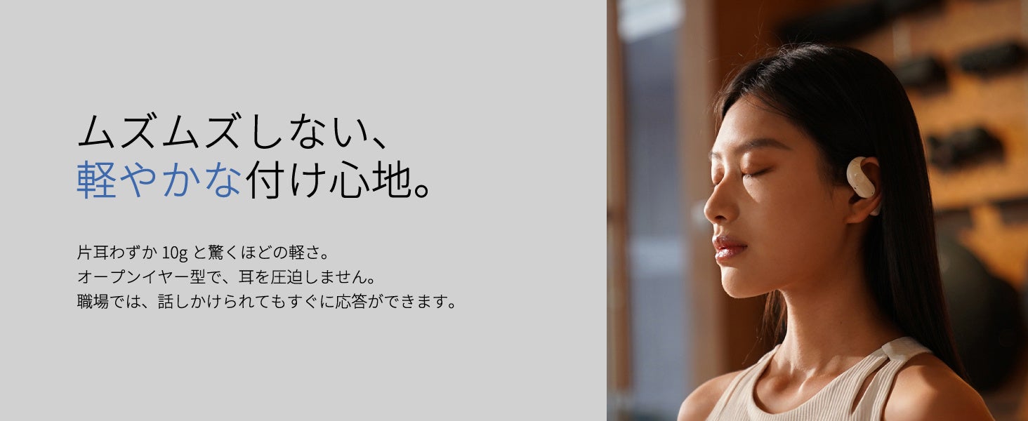 耳穴を塞がないため、長時間の使用でも圧迫感が少なく快適。片耳約10gの軽量設計で、周囲の音も自然に聞くことができます。