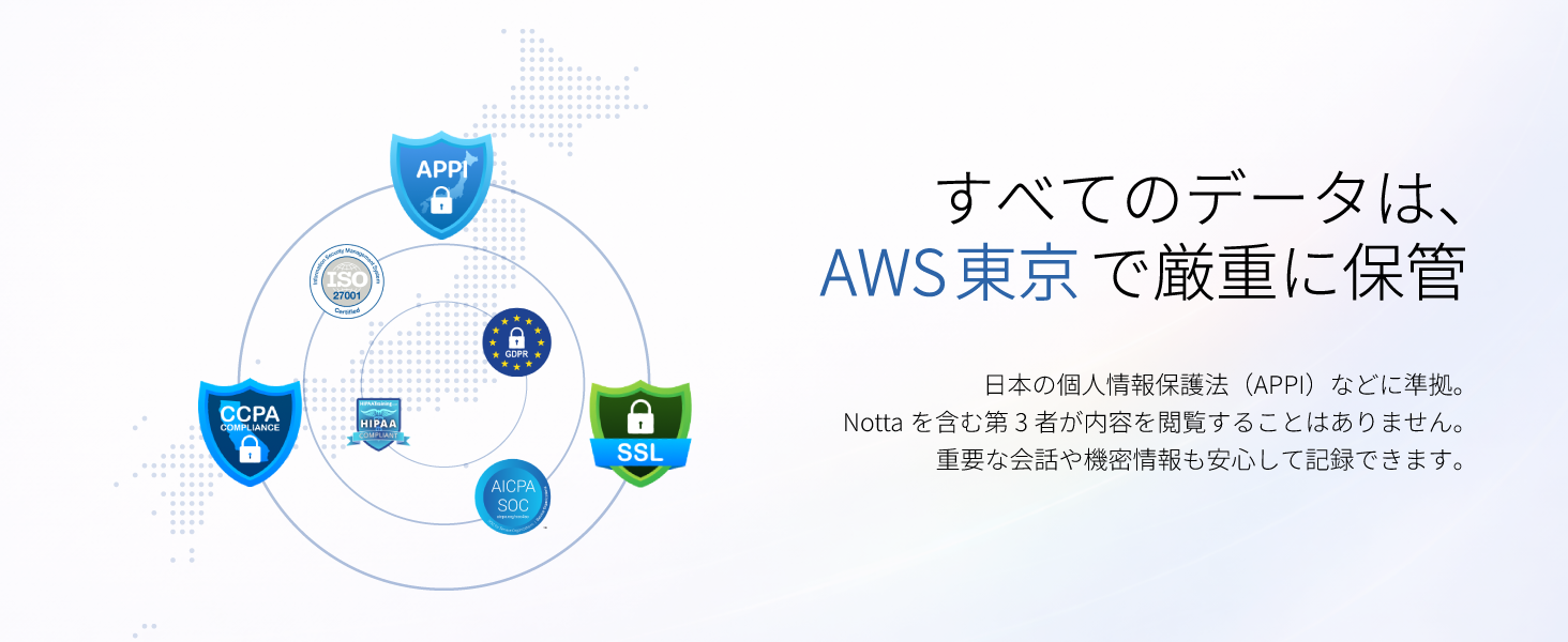 ISO27001を含む5つの国際セキュリティ認証を取得。収録データはすべて国内サーバーで厳重に保管され、多重暗号化で保護されています。Notta社を含む第三者がデータを閲覧することはありません。重要な会話や機密情報も、信頼して記録・活用いただけます。