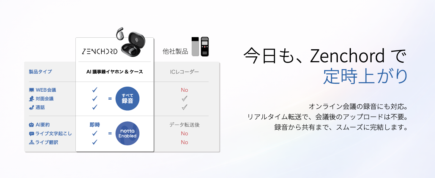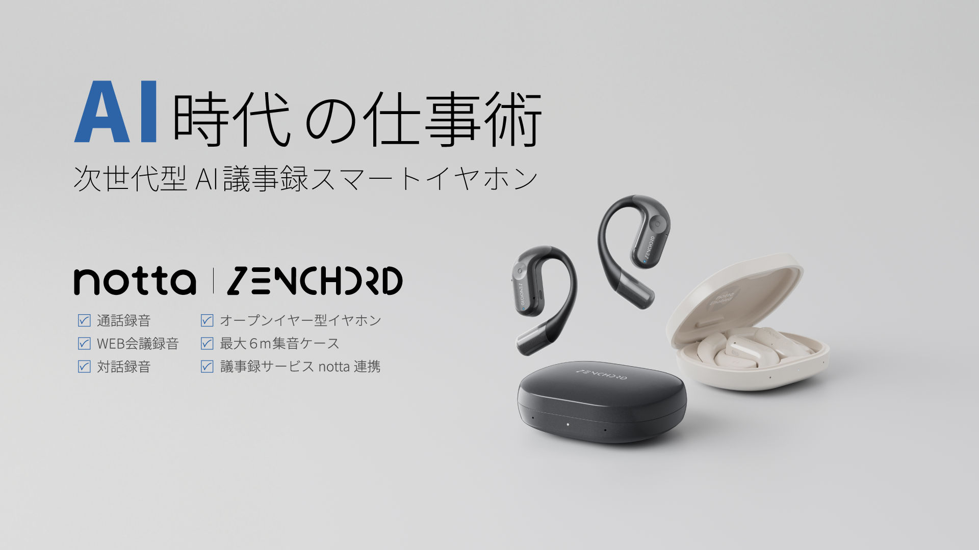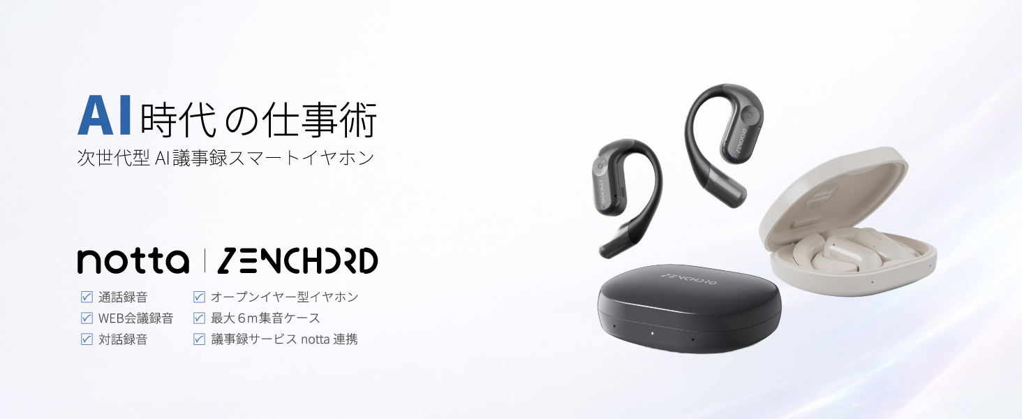 AI議事録イヤホン「Zenchord 1」は、オンライン会議から電話中、PCを開けない場面での会話まで、仕事の中で発生する様々なコミュニケーションを、ハンズフリーで記録できる点が特徴です。