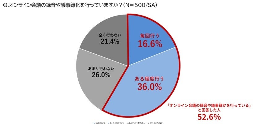 本調査では、52.6%が「オンライン会議の録音や議事録化を行っている」と回答しました。