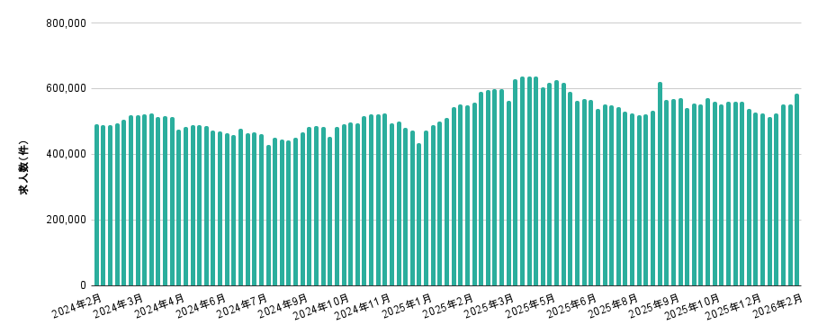 ■2月度の全国アルバイト・パート求⼈数は、584,550件(前⽉⽐+60,901件、前年同⽉⽐+40,025件)で前月から11.63%増加、前年同月から7.35%増加した。【図2】
