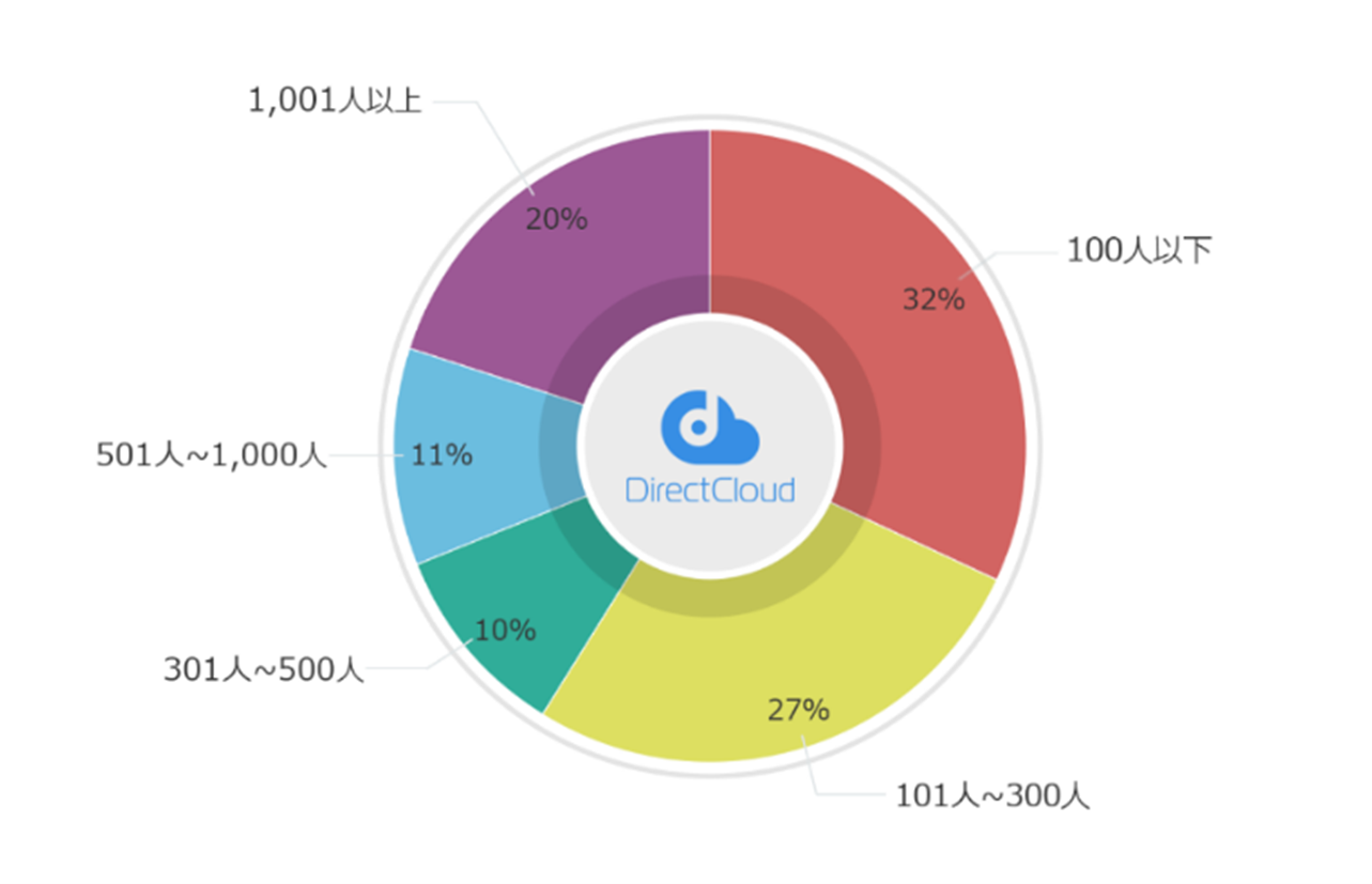 ご利用企業様の従業員規模は、100人以下(32%)、101人~300人(27%)、301人~500人(10%)、501人~1,000人(11%)、1,001人以上(20%)と幅広い規模の企業様にご導入いただいております。