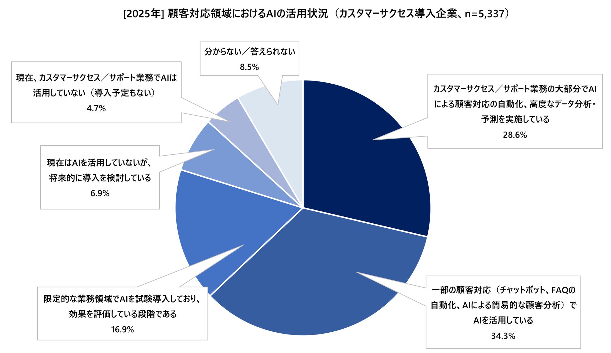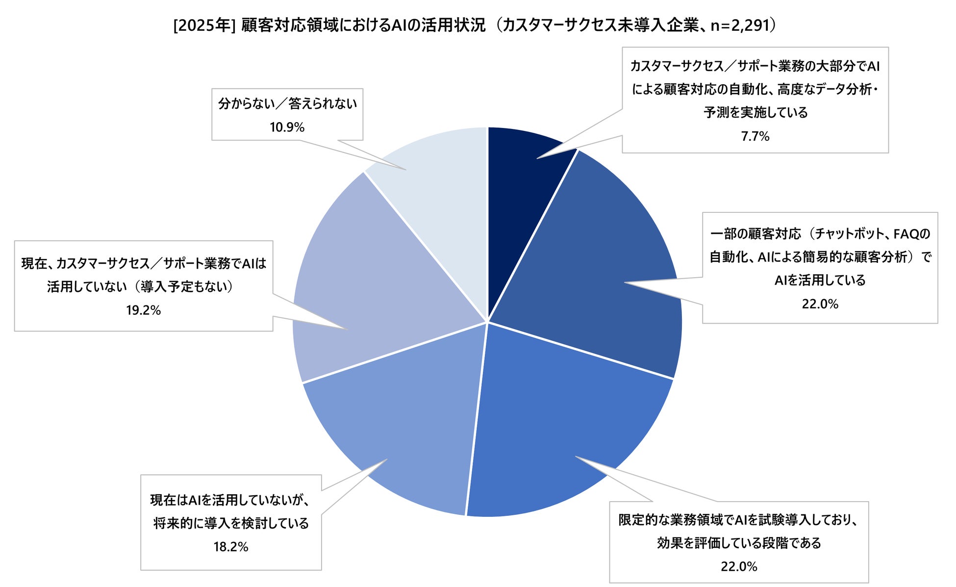 カスタマーサクセスでは顧客の継続利用や解約防止が収益に直結するため、AIを活用したデータ分析や自動化による効率化が導入の大きな動機となると考えられます。その結果、”大部分の業務をAI化”といった高度活用に踏み込む企業が増加しやすいのでしょう。一方で、カスタマーサクセスをまだ導入していない企業でも、AI導入に前向きな層が一定数います。これらの企業が部分的・試験的にAIを導入して効果を実感すれば、カスタマーサクセスの考え方にも興味を持つ可能性があります。逆に、カスタマーサクセス未導入かつAIにも消極的な層は、今後の市場競争で後れを取るリスクがあるかもしれません。AI導入は単なる業務効率化にとどまらず、顧客データに基づく個別最適化のサポートやプロアクティブな提案を可能にするため、カスタマーサクセス戦略と強い相乗効果を生み出します。今後は、カスタマーサクセスとAI導入の両輪が企業競争力を左右する重要な要因となると考えられます。
