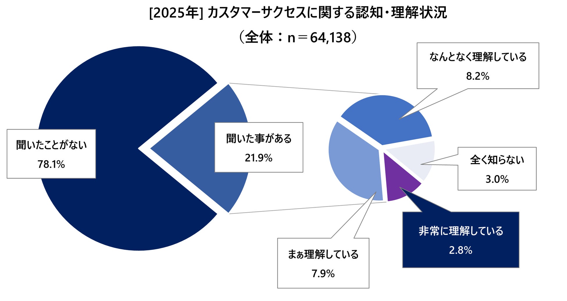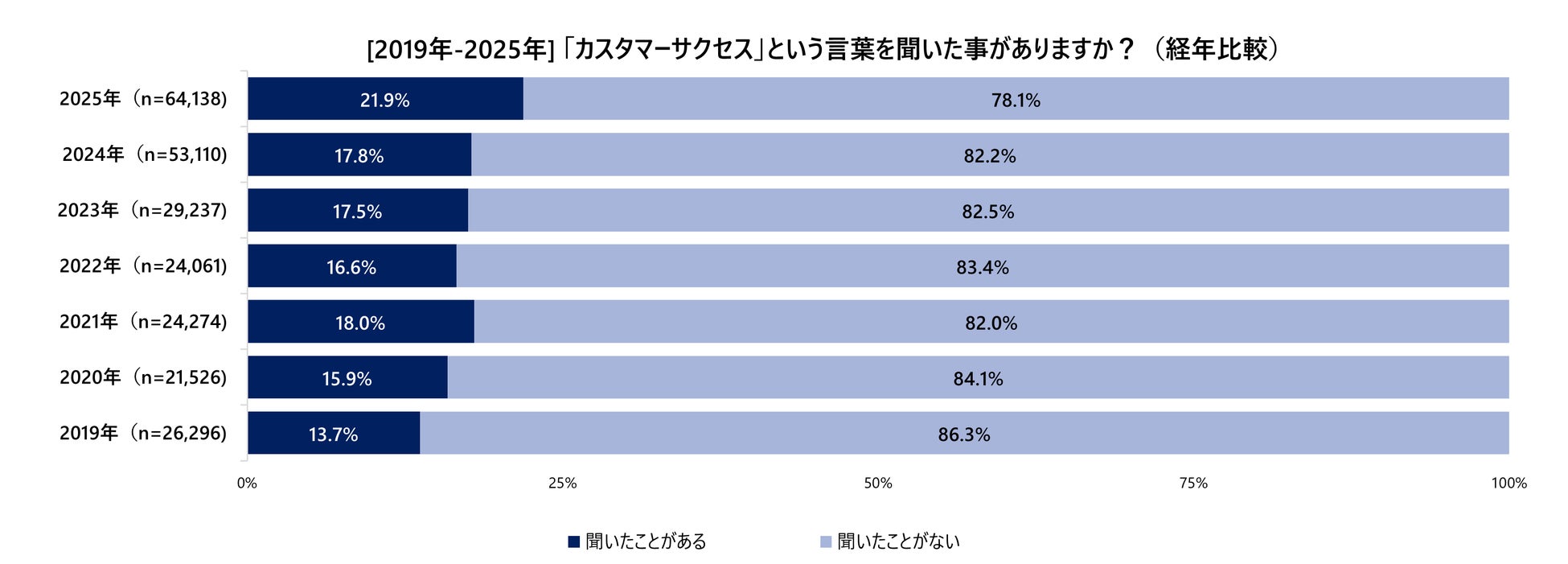 今回は全国の20歳から65歳までの有職者64,138人を対象に行った調査データをもとに、国内カスタマーサクセス市場全体の概況と現在地を確認していきます。まず、「カスタマーサクセスという言葉を聞いたことがありますか?」と尋ねたところ、「聞いたことがある」人は全体の21.9%、「聞いたことがない」と回答した人は78.1%という結果となりました。
