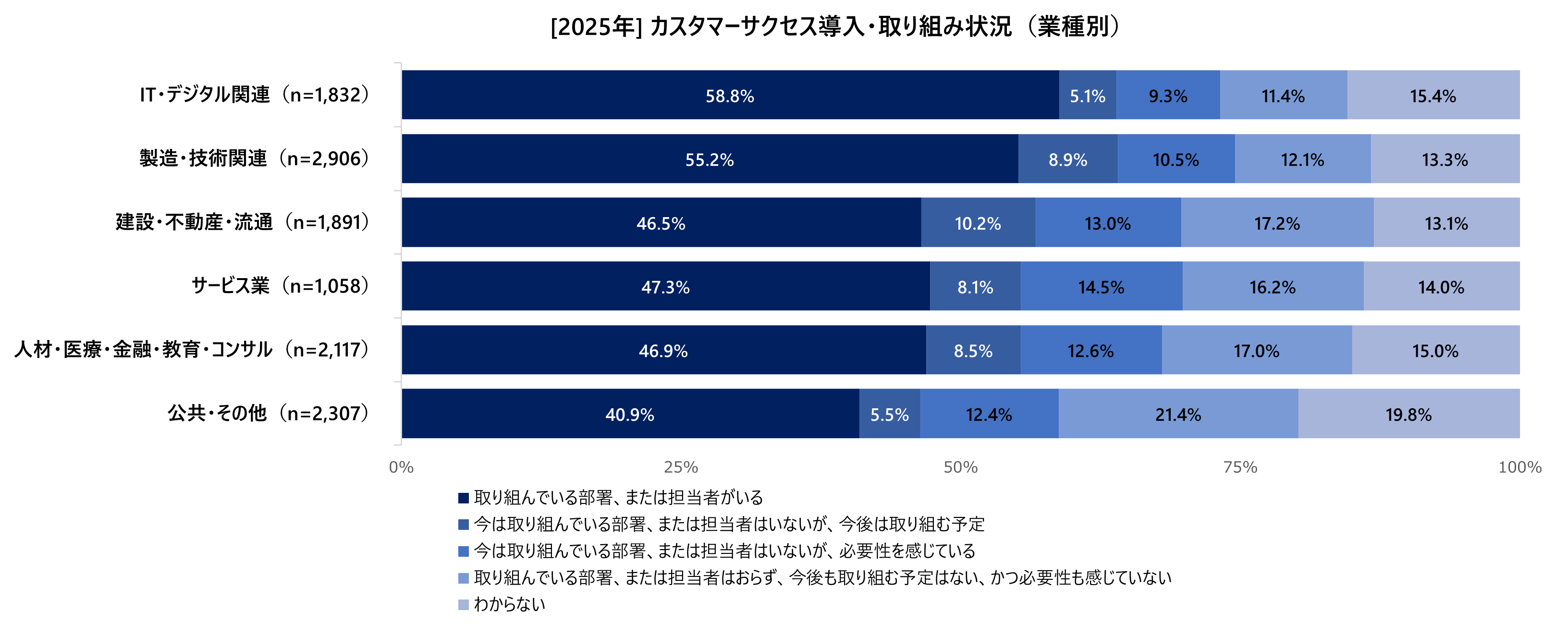 一方サブスク商材を扱っていない企業においては、カスタマーサクセスの取り組みを行っていると答えたのは34.8%で、「必要性を感じない」「わからない」層が相対的に多いことがわかります。顧客との継続契約が前提でないビジネスでは、解約率や継続率といった指標が経営課題として顕在化しにくく、カスタマーサクセスを導入する動機がやや薄くなりがちと推察されます。しかし、今後取り組む予定、必要性を感じている層を含めると、カスタマーサクセスの重要性を認識している人が半数以上いるということは、製品販売やサービス提供形態が“非サブスク”であっても、リピート購入や顧客満足度向上、アップセル/クロスセルなどを重視する企業にとってカスタマーサクセス的な取り組みが重要、と考えられていることを示唆するのではないでしょうか。