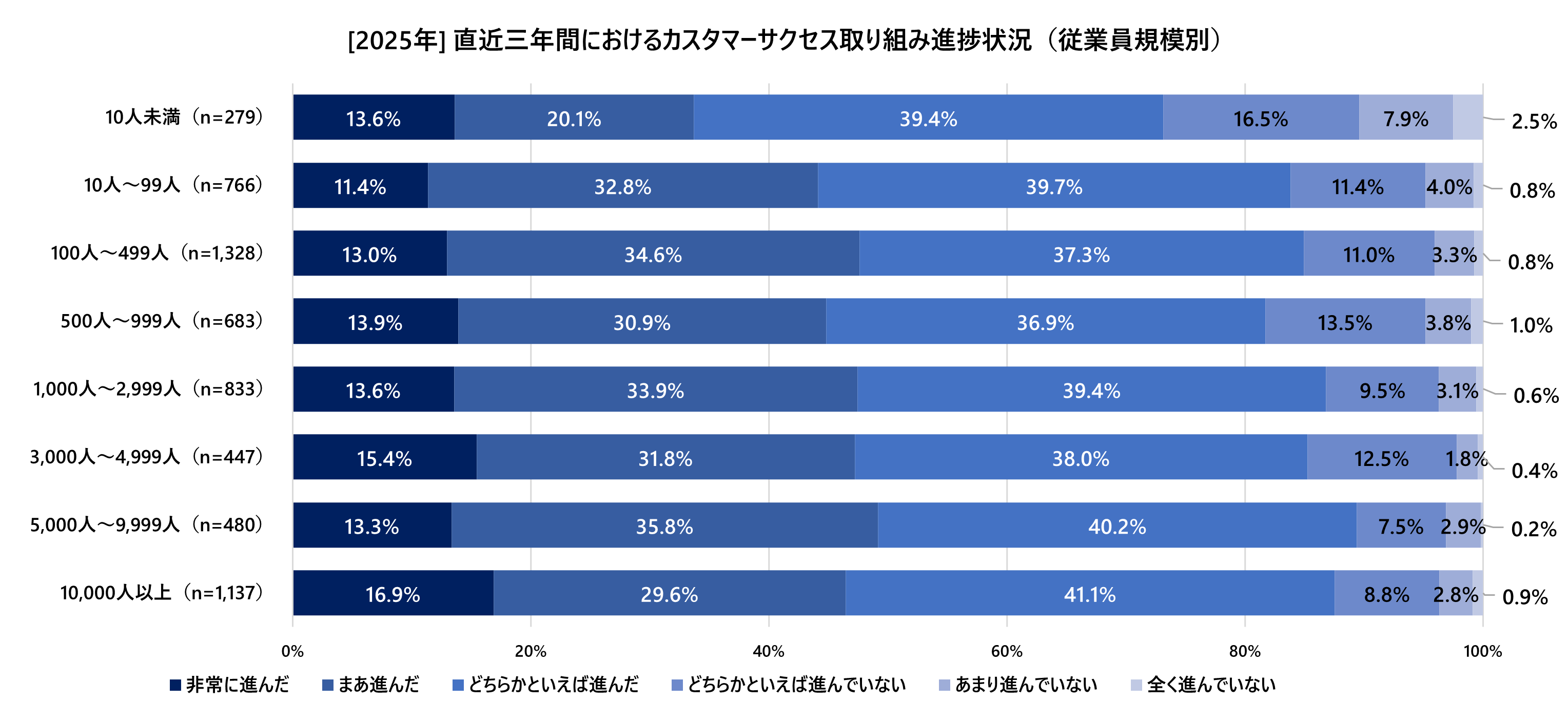 次のグラフはカスタマーサクセスを社内で取り組んでいると答えた人に対して、直近3年間でその取り組みが進んだかどうかを聞き、結果を2023年から2025年までの経年で示したものです。2025年は非常に進んだと答えた人が13.9%、まあ進んだと答えた人が32.0%、どちらかと言えば進んだという人が39.0%と、全体で84.9%の人がこの3年でカスタマーサクセスの取り組みが進んだとしていますが昨年よりは微減。2023年から2024年にかけて大きく進捗が見られていたのは、DX推進やサブスクビジネス拡大など、カスタマーサクセスを導入する外部環境の後押しがあったのかもしれません。それと比べると2024年から2025年にかけては緩やかな動きであるものの、2024年の急伸が一時的なブームではなく、ある程度定着していることがうかがえます。2025年のデータでは約4割が「どちらかといえば進んだ」と回答しており、企業の多くが「大きな成功体験」までは得られていないものの、着実に前進していると言えるのではないでしょうか。今後は、この層がどのように“まあ進んだ”や“非常に進んだ”レベルに上がっていけるかが、カスタマーサクセス全体の成熟度を左右することになるでしょう。