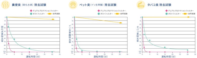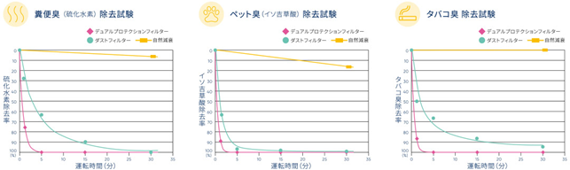 *4 :【試験機関】(株)環境管理センター【試験方法】1m³試験空間にて循環試験を実施 【臭気成分】糞便臭を想定した硫化水素、ペット臭を想定したイソ吉草酸、タバコ臭【脱臭の方法】ブルーエア 690iをスピード「1」運転で実施【試験結果】<介護環境臭>デュアルプロテクションフィルターを使用した場合は5分で99%以上除去。ダストフィルターを使用した場合も30分で約99%除去。<疑似ペット臭>デュアルプロテクションフィルターを使用した場合は5分で99%以上除去。ダストフィルターを使用した場合も30分で約99%除去。<タバコ臭>デュアルプロテクションフィルターを使用した場合は5分で99%以上除去。ダストフィルターを使用した場合も30分で約95%除去。*脱臭効果は周囲環境(温度・湿度)、運転時間、フィルターの使用期間、劣化状況、臭気によって異なる。