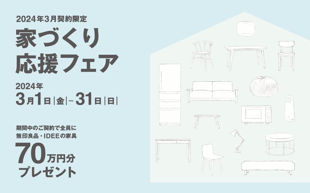 「無印良品の家」を展開する株式会社MUJI HOUSE(本社 東京都豊島区 代表取締役社長 堂前 宣夫)は、2024年3月1日(金)から3月31日(日)までの期間中、無印良品の家をご契約いただいた方を対象に無印良品・IDEEの家具70万円分をプレゼントする「家づくり応援フェア」を開催いたします。