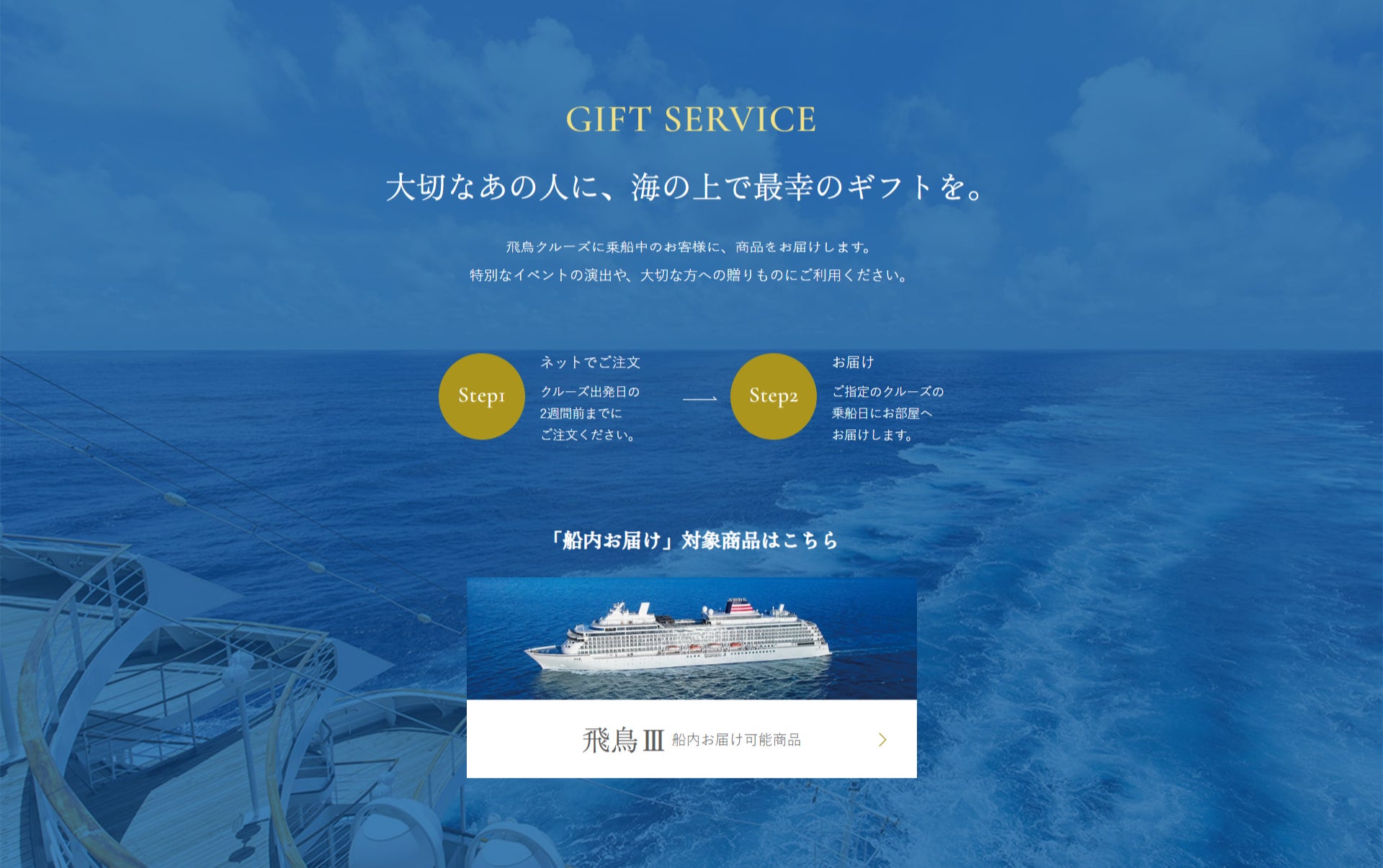 ご乗船されるお客様の“最幸の時間"を演出できるよう、飛鳥クルーズの乗船中にお部屋へお届けする「船内お届け」にも対応※しております。特別なイベントの演出や誕生日・アニバーサリーなど大切な方への贈りものとして、ギフトというかたちでお届けすることができます。