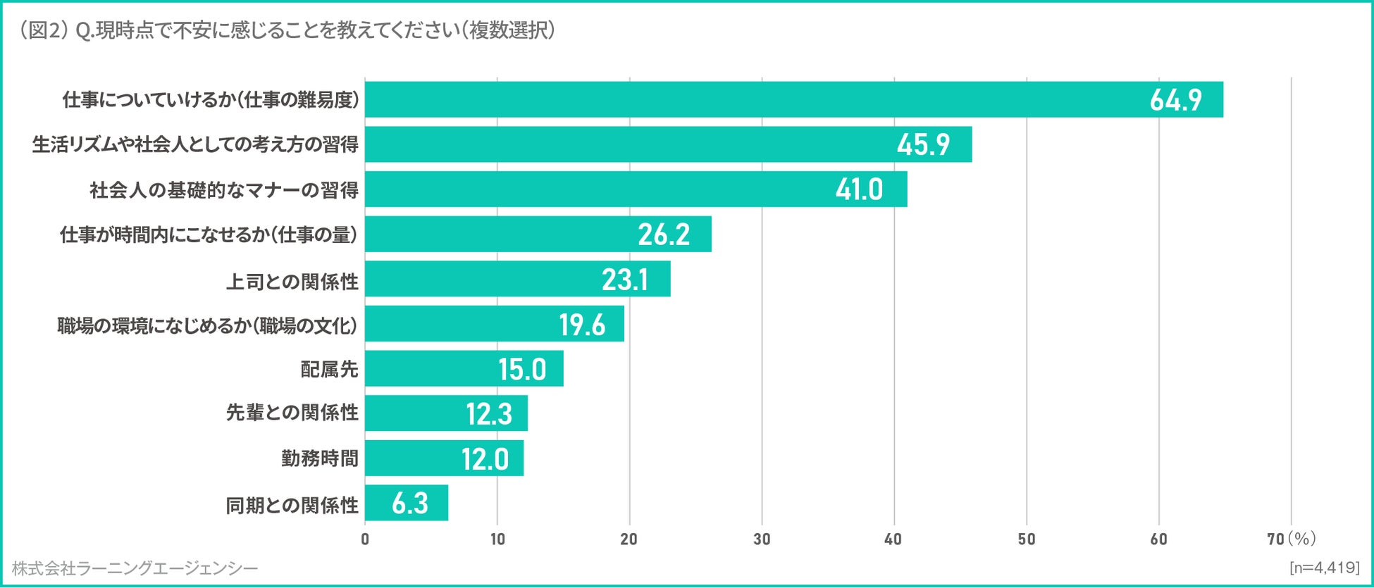次に、現時点で「不安」に感じることは何か質問したところ、「仕事についていけるか(仕事の難易度)」が64.9%と最も高い割合となりました。次に「生活リズムや社会人としての考え方の習得」が45.9%、「社会人の基礎的なマナーの習得」が41.0%と続きました。