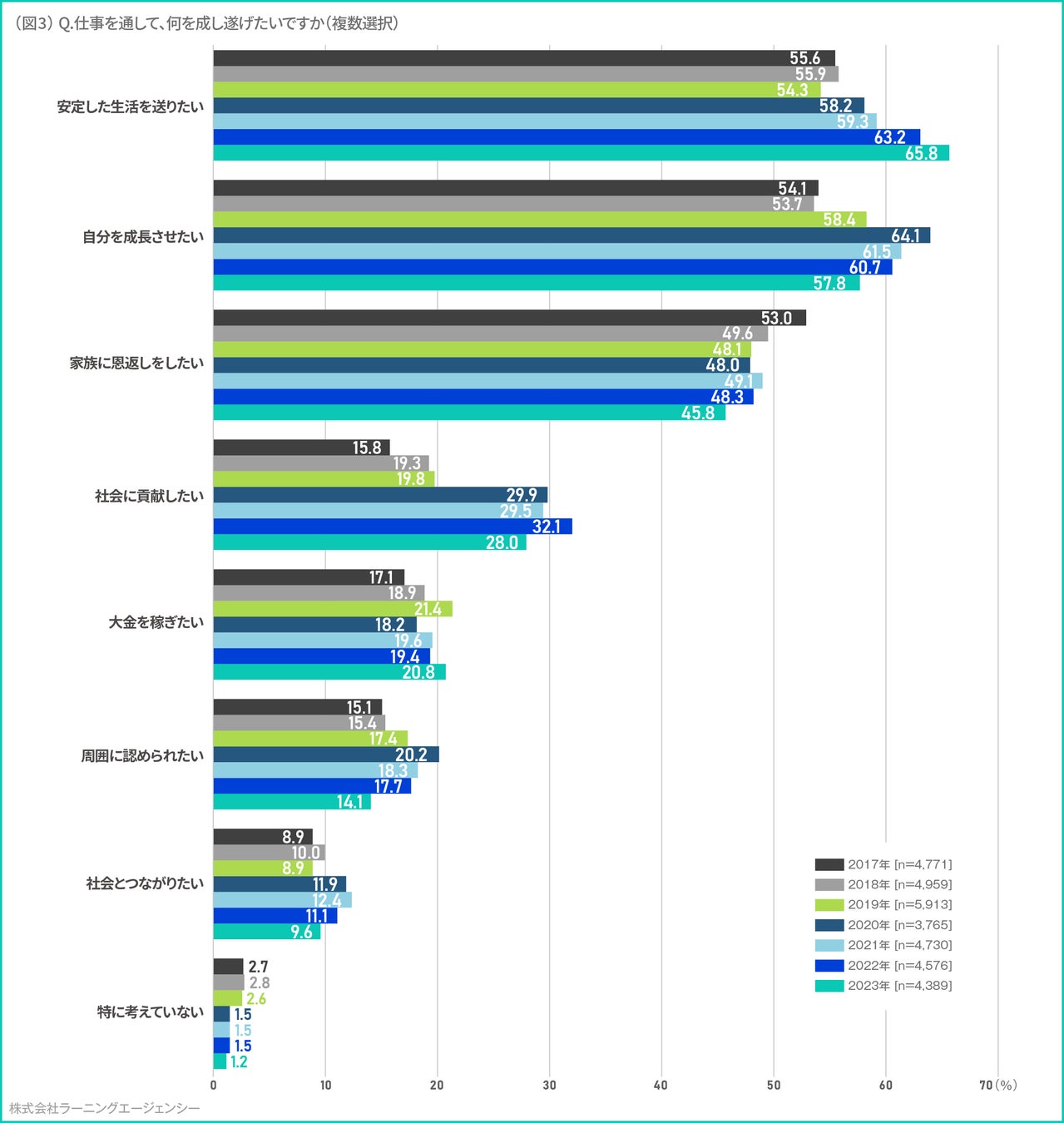 仕事を通して成し遂げたいことを質問したところ、「安定した生活を送りたい」が65.8%で最多に。この割合は過去最大の結果となり、2019年以降4年連続で増加しています。