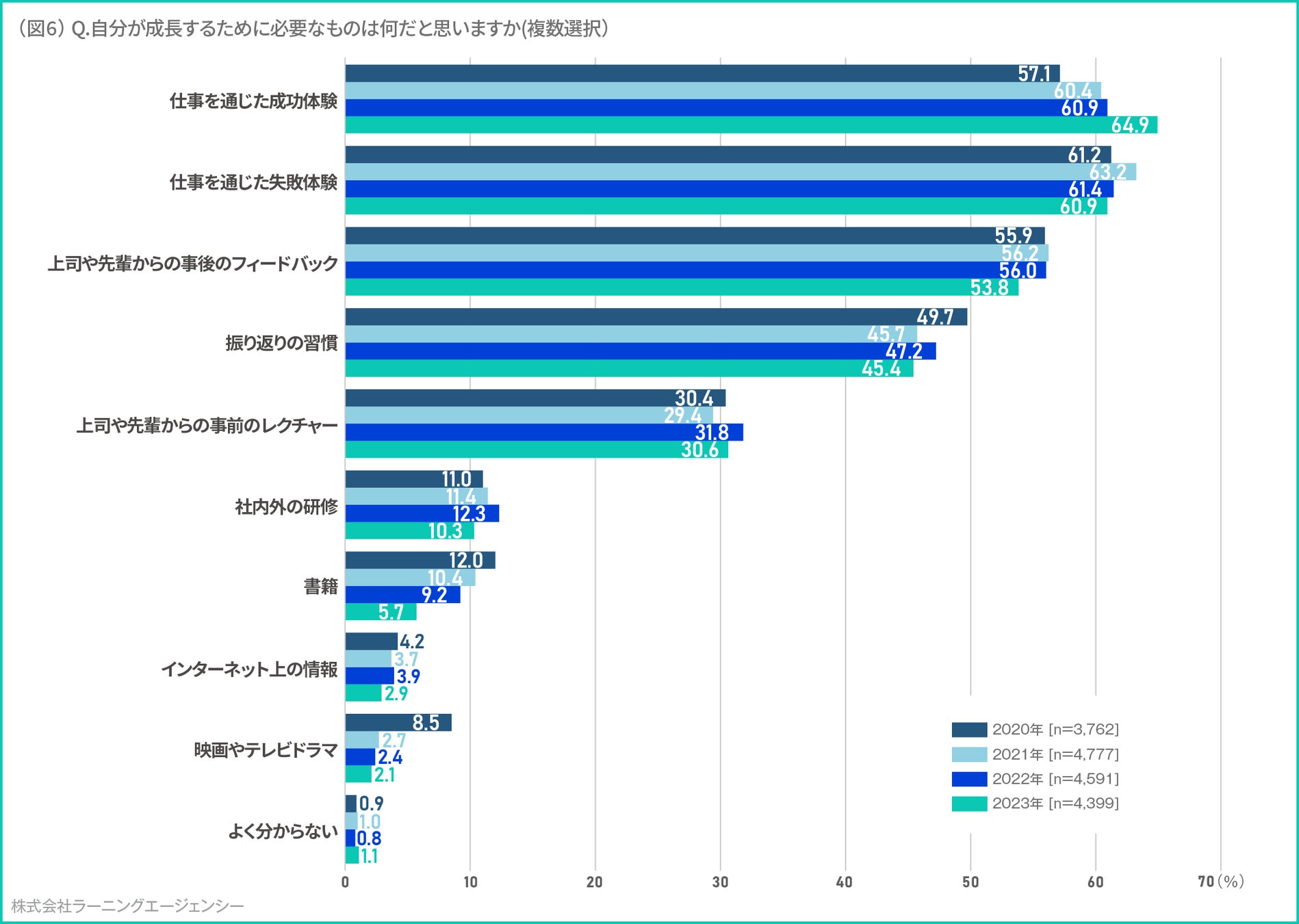 5.自分が成長するために必要なもの「仕事を通じた成功体験・失敗体験」が共に6割超え