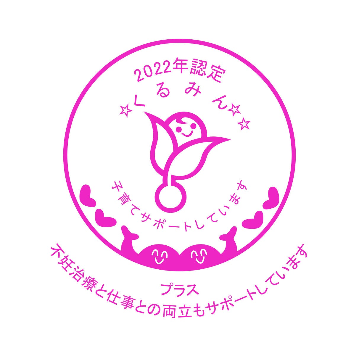 一般事業主行動計画の策定・届出を行った企業のうち、行動計画に掲げた目標の達成、男女労働者の育児休業取得実績、時間外労働平均月45 時間未満等のくるみん認定基準を満たした上で、不妊治療と仕事の両立しやすい職場環境整備に取り組み一定の要件を満たした企業に対し、厚生労働大臣(都道府県労働局長へ委任)が認定する制度です。