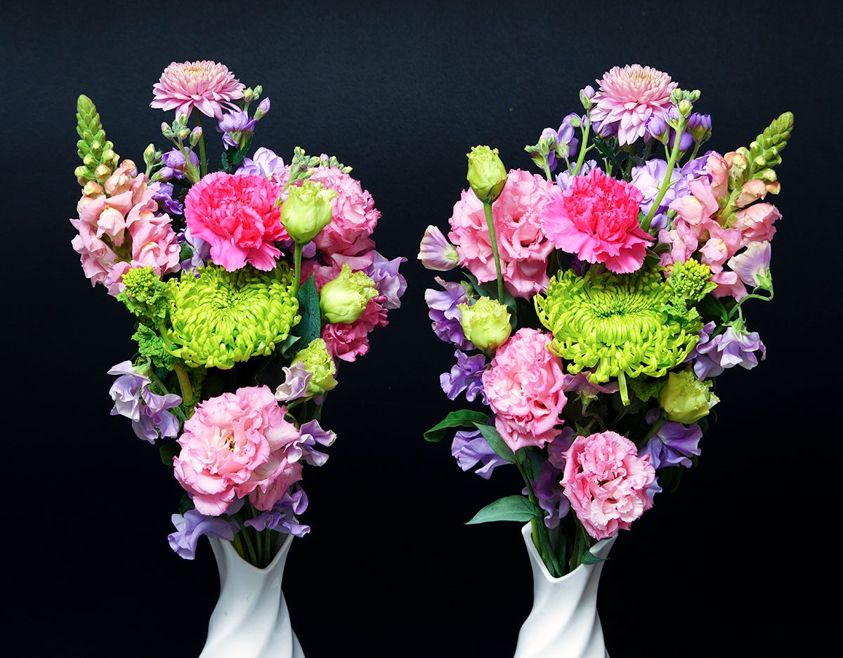 仏花として定番の白の和菊や色とりどりのスプレー菊を中心に、テッポウユリ、アイリス、菜の花などを組み合わせています。1対になるように春に咲く7種の花材を偶数本ずつ、ボリュームたっぷりの計20本前後でお届けします。