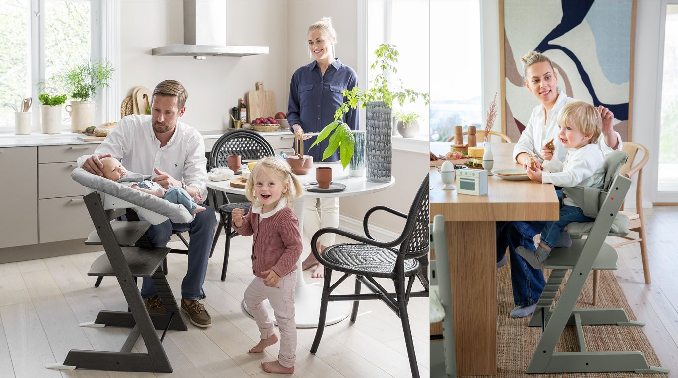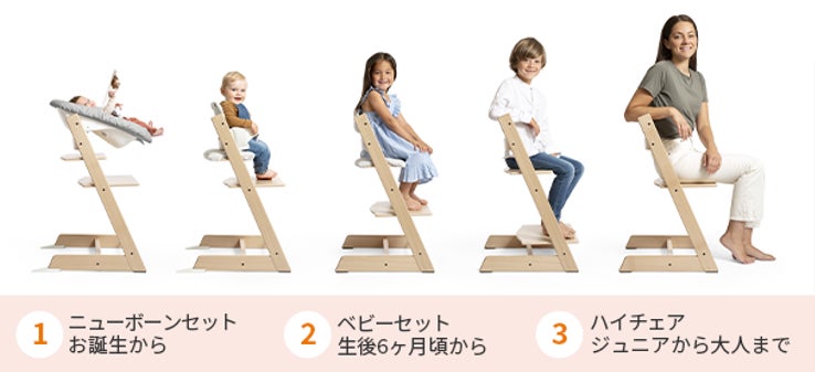 トリップ トラップは、年齢に応じたアクセサリーを使うことで新生児から大人になるまでずっと使える一生もののハイチェアです。ストッケが生まれた北欧の「赤ちゃんであってもひとりの個人として尊重する」という子育てへの考え方から、どんな大きさの子どもでも成長に合わせて調整でき、親子で目線を合わせて食卓を囲めるチェアが生まれました。