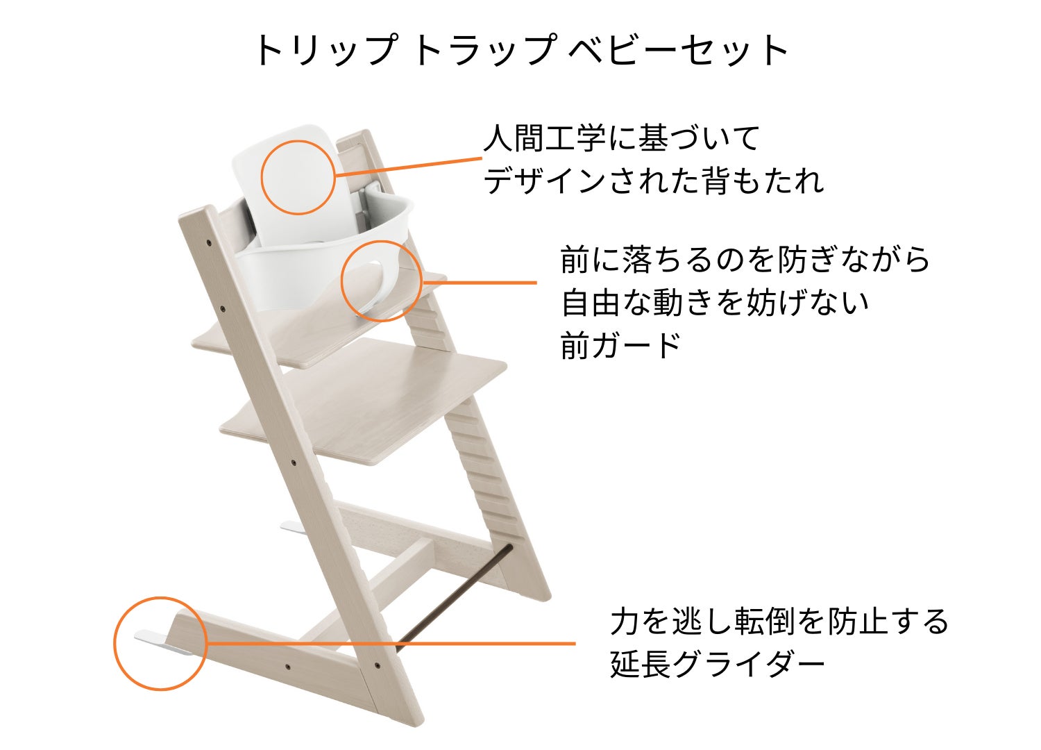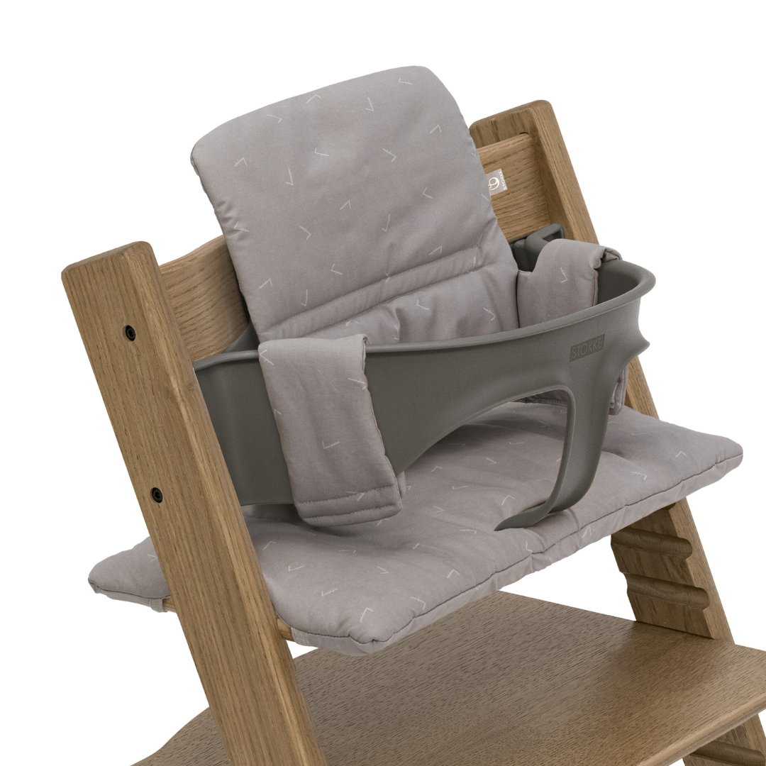 トリップ トラップの専用アクセサリー「ベビーセット」は、腰がすわった6ヶ月頃から3歳頃まで使用する必須アイテム。背もたれ・前ガード・延長グライダーのパーツがセットになっています。同色で揃える方もいらっしゃいますが、あえて別の色を選んで組み合わせを楽しむ方も。