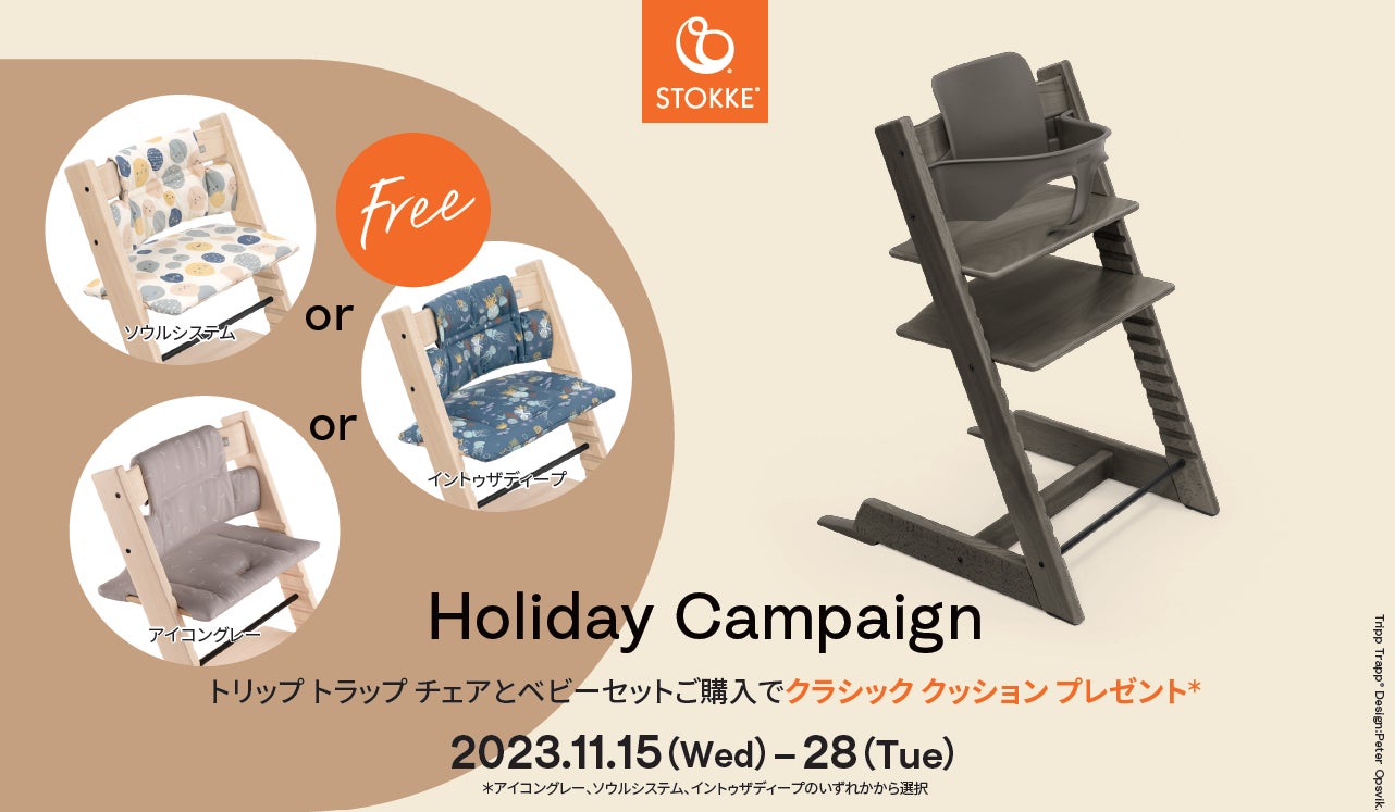11/15キャンペーンスタート 離乳食期におすすめ!北欧生まれストッケのチェア「トリップ トラップ」と離乳食期アクセサリーの購入で選べるクッションプレゼント