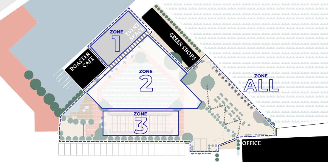 タープの開閉により雨天時も利用可能な屋外スペース。マルシェや野外ワークショップなどに適したゾーンです。