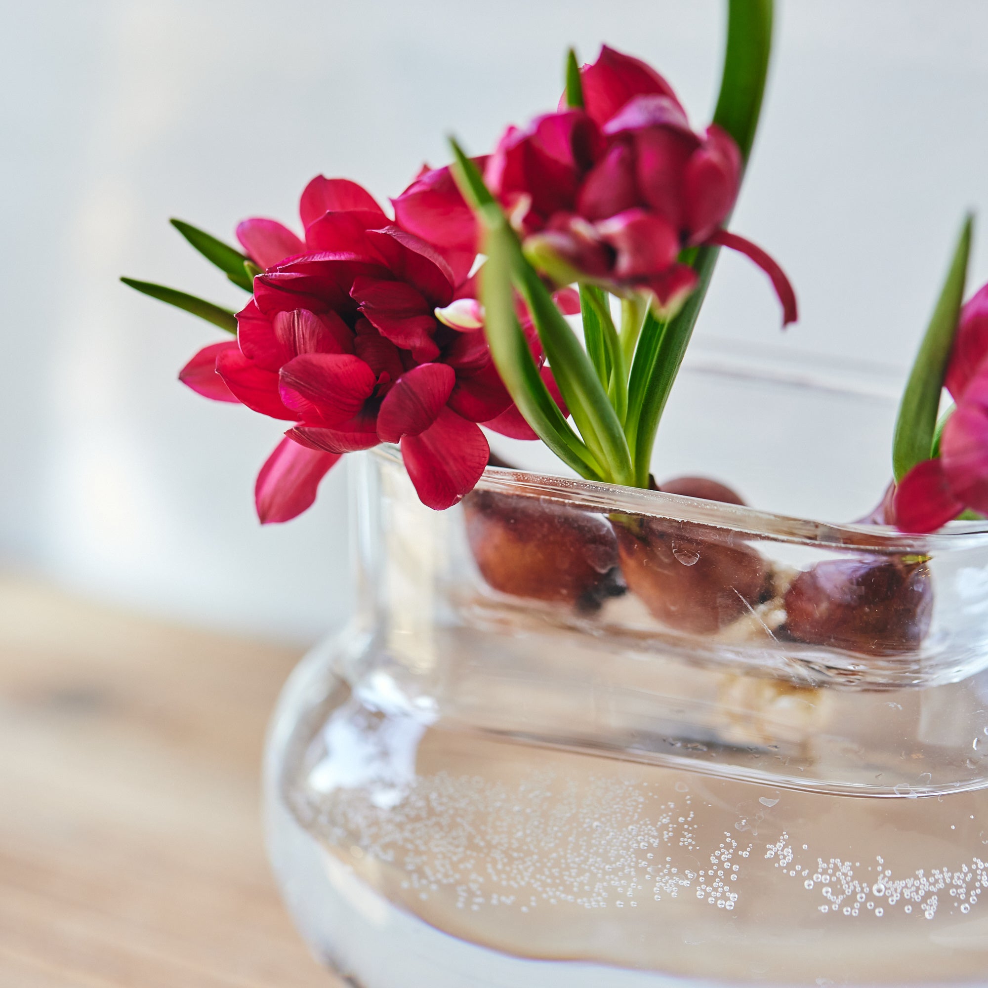 世界には5千以上の種が存在するといわれているチューリップ。咲き方は15系統に分類されており、花びらの重なり方や色など豊かな個性が魅力です。なかでもこの時期人気なのが「球根付き」のもの。