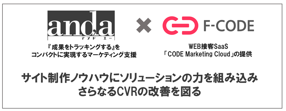 今回、エフ・コードはand,aとの業務提携を通じ、WEBサイトの全体方向性立案やその実制作に加え、サイト運用においてサイト内回遊やフォーム完了を促すCODE Marketing Cloudを導入することで、and,aがもつサイト制作ノウハウにソリューションの力を組み込み、さらなるCVR改善を目指します。