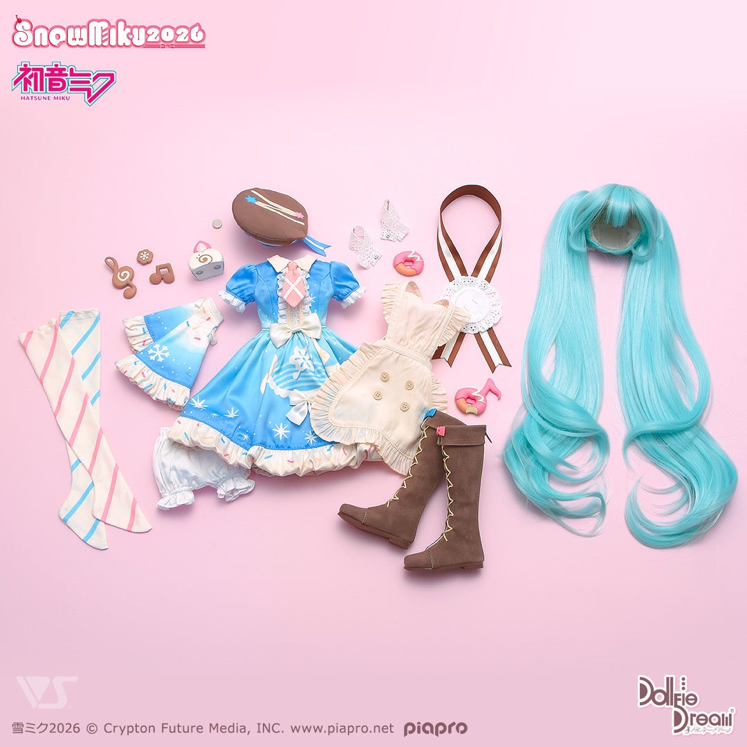 2026年の雪ミクテーマ「しあわせパティスリー」を表現した「Sweet Snow」がドルフィードリーム用ドレスセットで登場! パステル調の可愛らしさ溢れる衣装デザインを忠実に再現しました♪