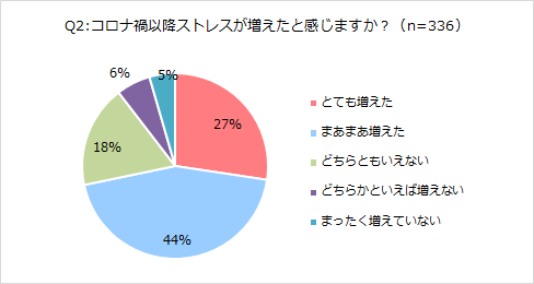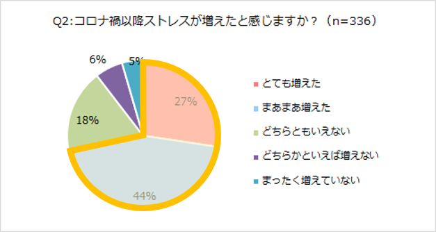 コロナ禍以降ストレスが増えたと感じますか?という質問には全体の7割以上が「増えた」と回答