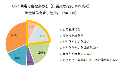 また、自宅での染髪の機会について尋ねた設問では、自宅での白髪染め/おしゃれ染めの機会が「とても増えた(8%)」、「まあまあ増えた(16%)」となっており、もともと白髪染め/おしゃれ染めをしないという人を除くと、 4割近くの人が「自宅で自ら髪を染める機会が増えた」と回答しました。