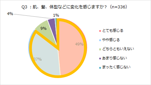 肌や髪、体型などで変化を感じるかを聞いたところ、8割以上の人が「とても感じる(49%)」「やや感じる(37%)」と答えました。