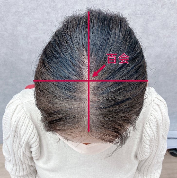 ①生え際から百会(頭頂部)に向かって両手の中指と薬指を使い気持ち良いくらいの強さで押していく(2~3回程度・一方通行)